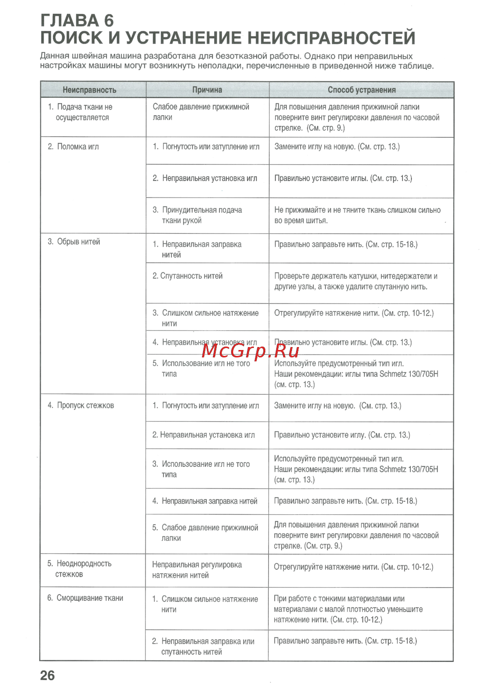 ГЛАВА 6 ПОИСК И УСТРАНЕНИЕ НЕИСПРАВНОСТЕЙ Данная швейная машина разработана для безотказной работы Однако при неправильных настройках машины могут возникнуть неполадки перечисленные в приведенной ниже таблице Причина Неисправность 1 Подача ткани не осуществляется Слабое давление прижимной лапки Способ устранения Для повышения давления прижимной лапки поверните винт регулировки давления по часовой стрелке См стр 9 2 Поломка игл 1 Погнутость или затупление игл Замените иглу на новую См стр 13 2 Неправильная установка игл Правильно установите иглы См стр 13 3 Принудительная подача ткани рукой 3 Обрыв нитей 1 Неправильная заправка Не прижимайте и не тяните ткань слишком сильно во время шитья Правильно заправьте нить См стр 15 18 нитей 2 Спутанность нитей Проверьте держатель катушки нитедержатели и другие узлы а также удалите спутанную нить 3 Слишком сильное натяжение Отрегулируйте натяжение нити См стр 10 12 нити 4 Неправильная установка игл Правильно установите иглы См стр 13 5 Использование игл не того Используйте предусмотренный тип игл типа Наши рекомендации иглы типа Schmetz 130 705Н см стр 13 4 Пропуск стежков 1 Погнутость или затупление игл Замените иглу на новую См стр 13 2 Неправильная установка игл Правильно установите иглу См стр 13 3 Использование игл не того типа Используйте предусмотренный тип игл Наши рекомендации иглы типа Schmetz 130 705Н см стр 13 4 Неправильная заправка нитей Правильно заправьте нить См стр 15 18 5 Слабое давление прижимной Для повышения давления прижимной лапки лапки поверните винт регулировки давления по часовой стрелке См стр 9 5 Неоднородность стежков 6 Сморщивание ткани Неправильная регулировка Отрегулируйте натяжение нити См стр 10 12 натяжения нитей 1 Слишком сильное натяжение нити При работе с тонкими материалами или материалами с малой плотностью уменьшите натяжение нити См стр 10 12 2 Неправильная заправка или спутанность нитей 26 Правильно заправьте нить См стр 15 18