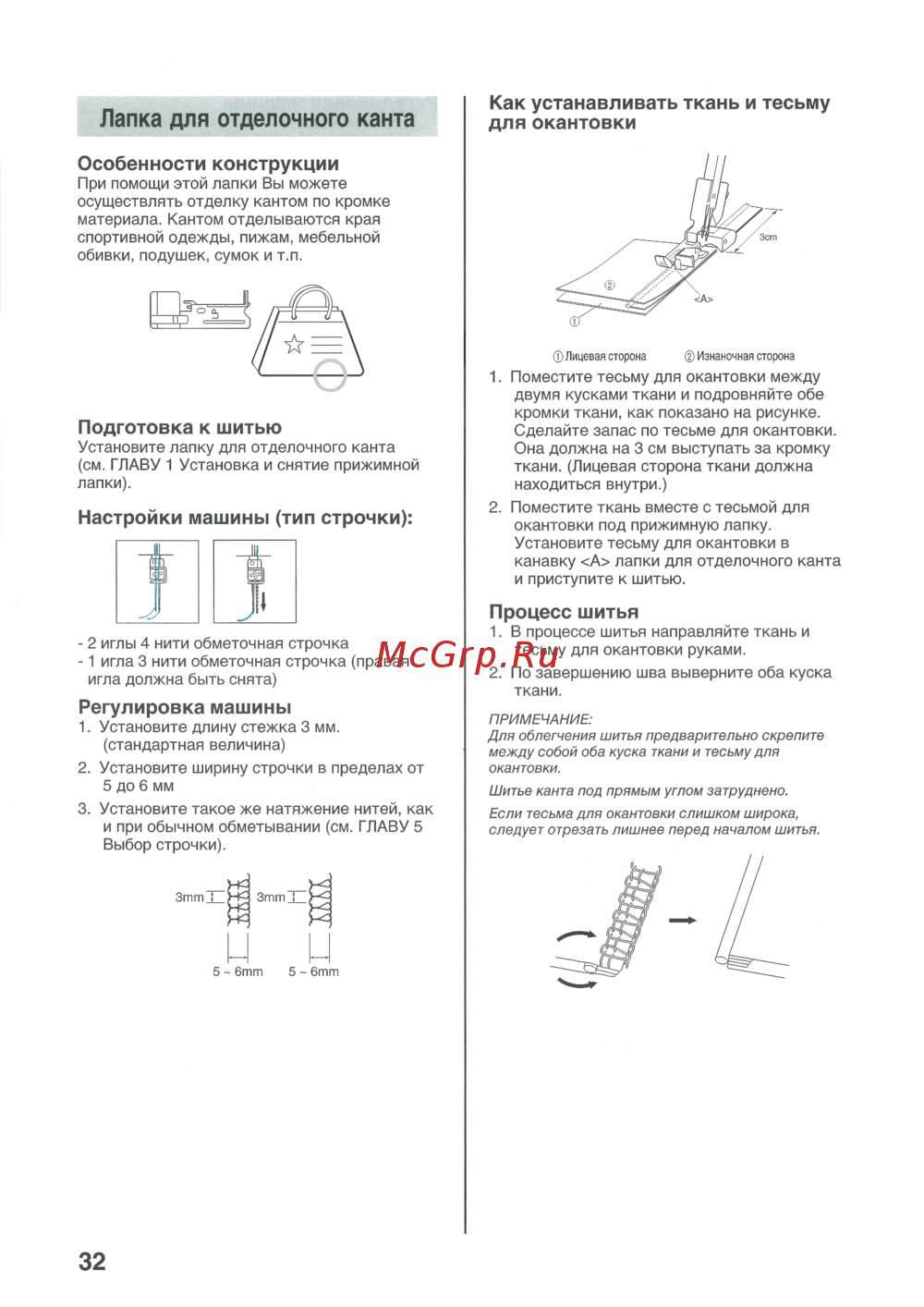 Лапка для отделочного канта Как устанавливать ткань и тесьму для окантовки Особенности конструкции При помощи этой лапки Вы можете осуществлять отделку кантом по кромке материала Кантом отделываются края спортивной одежды пижам мебельной обивки подушек сумок и т п ф Лицевая сторона Изнаночная сторона Подготовка к шитью Установите лапку для отделочного канта см ГЛАВУ 1 Установка и снятие прижимной лапки Настройки машины тип строчки 1 Поместите тесьму для окантовки между двумя кусками ткани и подровняйте обе кромки ткани как показано на рисунке Сделайте запас по тесьме для окантовки Она должна на 3 см выступать за кромку ткани Лицевая сторона ткани должна находиться внутри 2 Поместите ткань вместе с тесьмой для окантовки под прижимную лапку Установите тесьму для окантовки в канавку А лапки для отделочного канта и приступите к шитью Процесс шитья 2 иглы 4 нити обметочная строчка 1 игла 3 нити обметочная строчка правая игла должна быть снята Регулировка машины 1 Установите длину стежка 3 мм стандартная величина 2 Установите ширину строчки в пределах от 5 до 6 мм 3 Установите такое же натяжение нитей как и при обычном обметывании см ГЛАВУ 5 Выбор строчки 32 1 В процессе шитья направляйте ткань и тесьму для окантовки руками 2 По завершению шва выверните оба куска ткани ПРИМЕЧАНИЕ Для облегчения шитья предварительно скрепите между собой оба куска ткани и тесьму для окантовки Шитье канта под прямым углом затруднено Если тесьма для окантовки слишком широка следует отрезать лишнее перед началом шитья
