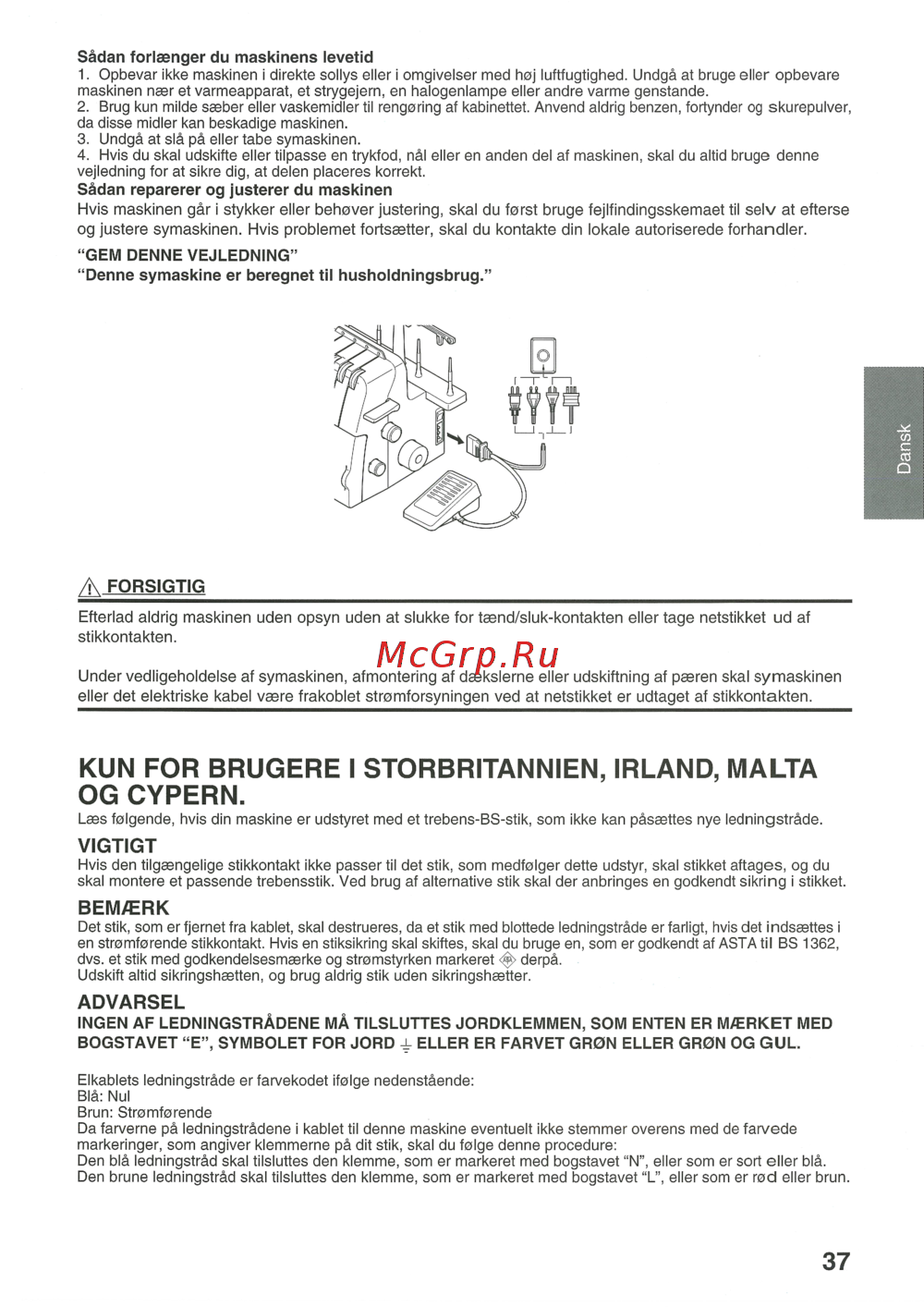 Sädan forlaenger du maskinens levetid 1 Opbevar ikke maskinen i direkte sollys eher i omgivelser med hoj Iuftfugtighed llndgä at bruge eller opbevare maskinen neer et varmeapparat et strygejern en halogenlampe eller andre varme genstande 2 Brug kun milde sseber eller vaskemidler til rengoring af kabinettet Anvend aldrig benzen fortynder og skurepulver da disse midler kan beskadige maskinen 3 Undgä at slä pä eller tabe symaskinen 4 Hvis du skal udskifte eller tilpasse en trykfod näl eller en anden del af maskinen skal du altid bruge denne vejledning for at sikre dig at delen placeres korrekt Sädan reparerer og justerer du maskinen Hvis maskinen gär i stykker eller behover justering skal du forst bruge fejlfindingsskemaet til selv at efterse og justere symaskinen Hvis problemet fortssetter skal du kontakte din lokale autoriserede forhandler GEM DENNE VEJLEDNING Dansk Denne symaskine er beregnet til hushoidningsbrug A FORSIGTIG_________________________________________________________________ Efterlad aldrig maskinen uden opsyn uden at slukke for tænd sluk kontakten eller tage netstikket ud af stikkontakten Under vedligeholdelse af symaskinen afmontering af dækslerne eller udskiftning af pæren skal symaskinen eller det elektriske kabel være frakoblet stromforsyningen ved at netstikket er udtaget af stikkontakten KUN FOR BRUGERE I STORBRITANNIEN IRLAND MALTA OG CYPERN Læs folgende hvis din maskine er udstyret med et trebens BS stik som ikke kan pâsættes nye ledningsträde VIGTIGT Hvis den tilgængelige stikkontakt ikke passer til det stik som medfolger dette udstyr skal stikket aftages og du skal moniere et passende trebensstik Ved brug af alternative stik skal der anbringes en godkendt sikring i stikket BEMÆRK Det stik som er fjernet fra kablet skal destrueres da et stik med blottede ledningsträde er farligt hvis det indsættes i en stromforende stikkontakt Hvis en stiksikring skal skiftes skal du bruge en som er godkendt af ASTA til BS 1362 dvs et stik med godkendelsesmærke og stromstyrken markeret derpä Udskift altid sikringshætten og brug aldrig stik uden sikringshætter ADVARSEL INGEN AF LEDNINGSTRÂDENE MÂ TILSLUTTES JORDKLEMMEN SOM ENTEN ER MÆRKET MED BOGSTAVET E SYMBOLET FOR JORD 4 ELLER ER FARVET GR0N ELLER GR0N OG GUL Elkablets ledningsträde er farvekodet folge nedenstäende Blâ Nul Brun Stromforende Da farverne pâ ledningstrâdene i kablet til denne maskine eventuelt ikke stemmer overens med de farvede markeringer som angiver klemmerne pâ dit stik skal du folge denne procedure Den blâ ledningstrâd skal tilsluttes den klemme som er markeret med bogstavet N eller som er sort eller blä Den brune ledningstrâd skal tilsluttes den klemme som er markeret med bogstavet L eller som er rod eller brun 37