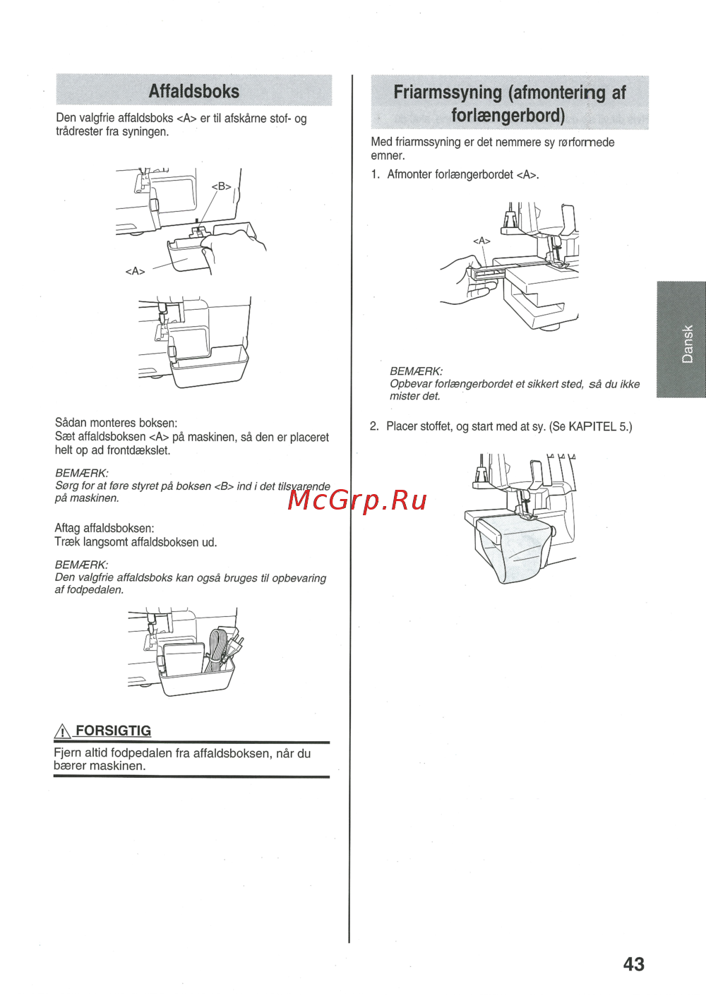 Affaldsboks Den valgfrie affaldsboks A er til afskärne Stof og trädrester fra syningen Friarmssyning afmontering af forlaengerbord Med friarmssyning er det nemmere sy rorformede emner 1 Afmonter forlsengerbordet A B J A Dansk A lyEHT BEM ERK Opbevar forlaengerbordet et sikkert sted sä du ikke mister det Sädan monteres boksen Sset affaldsboksen A pä maskinen sä den er placeret helt op ad frontdcekslet BEM ERK Sorg for at fore styret pä boksen B ind det tilsvarende pä maskinen 2 Placer stoffet og Start med at sy Se KAPITEL 5 IMS Aftag affaldsboksen Trask langsomt affaldsboksen ud BEM ERK Den valgfrie affaldsboks kan ogsä bruges til opbevaring af fodpedalen A FORSIGTIG________________________ Fjern altid fodpedalen fra affaldsboksen när du baerer maskinen 43