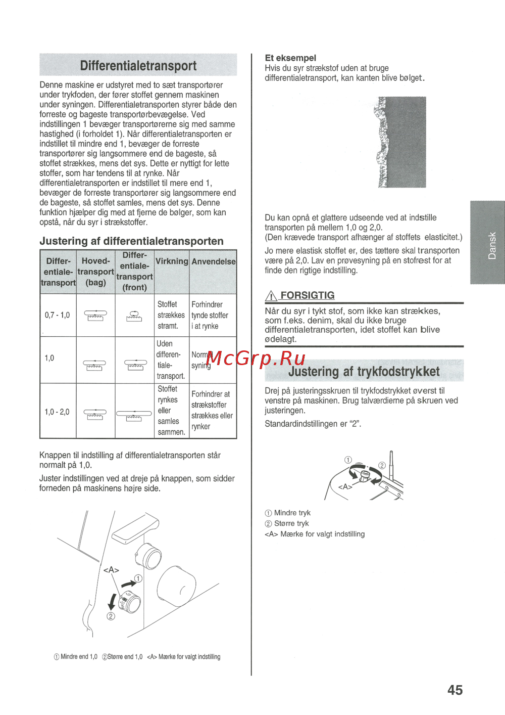 Et eksempel Hvis du syr strækstof uden at bruge differentialetransport kan kanten blive bolget Denne maskine er udstyret med to seet transportorer under trykfoden der forer stoffet gennem maskinen under syningen Differentialetransporten styrer bade den forreste og bageste transportorbevaegelse Ved indstillingen 1 bevaeger transportorerne sig med samme hastighed i forholdet 1 Nar differentialetransporten er indstillet til mindre end 1 bevaeger de forreste transportorer sig langsommere end de bageste sa stoffet straekkes mens det sys Dette er nyttigt for lette stoffer som har tendens til at rynke Nar differentialetransporten er indstillet til mere end 1 bevaeger de forreste transportorer sig langsommere end de bageste sa stoffet sarnies mens det sys Denne funktion hjeelper dig med at fjerne de bolger som kan opsta nar du syr i straekstoffer Justering af differentialetransporten Differ Hoved entiale transport transport bag Differ entiale Virkning Anvendelse transport front Forhindrer strækkes tynde stoffer stramt i at rynke Uden 1 0 Jo mere elastisk stoffet er des tættere skal transporten være pâ 2 0 Lav en provesyning pâ en stofrest for at finde den rigtige indstilling A FORSIGTIG Stoffet 0 7 1 0 Du kan opnâ et glattere udseende ved at indstille transporten pâ mellem 1 0 og 2 0 Den krævede transport afhænger af stoffets elasticitet differen Normal tiale syning Nâr du syr i tykt stof som ikke kan strækkes som f eks denim skal du ikke bruge differentialetransporten idet stoffet kan blive odelagt Justering af trykfodstrykket transport Stoffet rynkes 1 0 2 0 Dansk Differentialetransport eller samles sammen Forhindrer at strækstoffer strækkes eller rynker Drej pâ justehngsskruen til trykfodstrykket overst til venstre pâ maskinen Brug talværdierne pâ skruen ved justeringen Standardindstillingen er 2 Knappen til indstilling af differentialetransporten stâr normalt pâ 1 0 Juster indstillingen ved at dreje pâ knappen som sidder forneden pâ maskinens hojre side CD Mindre tryk Storre tryk A Mærke for valgt indstilling Mindre end 1 0 Storre end 1 0 A Mærke for valgt indstilling 45