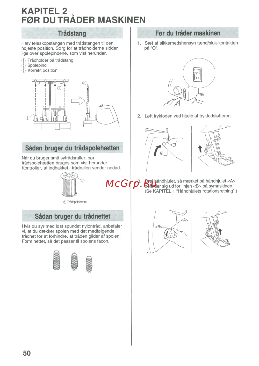 KAPITEL 2 F0R DUTRÄDER MASKINEN For du träder maskinen Tradstang Haev teleskopstangen med tradstangen til den hojeste position Sorg for at tradholderne sidder lige over spolepindene som vist herunder 1 Saet pä O af sikkerhedshensyn taend sluk kontakten Tradholder pa tradstang Spolepind Korrekt position 2 Loft trykfoden ved hjaelp af trykfodslofteren Sädan bruger du trädspolehaetten När du bruger smä syträdsruller bor trädspolehaetten bruges som vist herunder Kontroller at indhakket i trädrullen vender nedad 3 Trädspolehaette Sädan bruger du trädnettet Hvis du syr med lost spundet nylonträd anbefaler vi at du daekker spolen med det medfolgende trädnet for at forhindre at träden glider af spolen Form nettet sä det passer til spolens facon 50 Drej händhjulet sä maerket pä händhjulet befinder sig ud for linjen B pä symaskinen Se KAPITEL 1 Händhjulets rotationsretning A