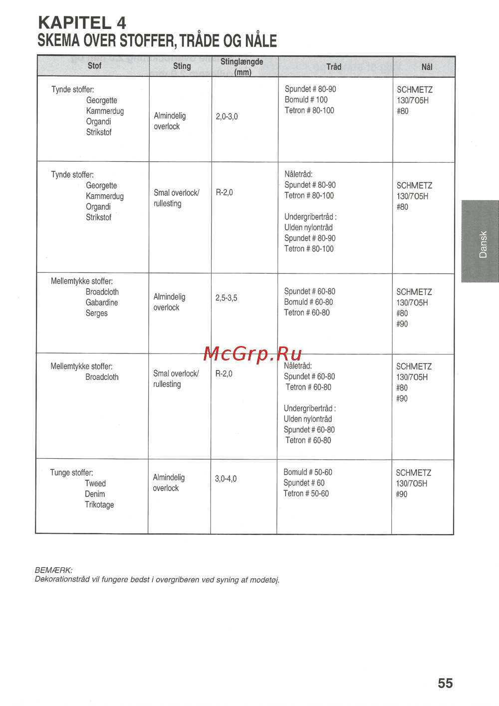 KAPITEL 4 SKEMA OVER STOFFER TRÂDE OG NÂLE Stof Sting Stinglængde Träd mm Spundet 80 90 Tynde Stoffer Nâl SCHMETZ Georgette Bomuld 100 130 7O5H Kammerdug Tetron 80 100 80 Organdi Strikstof Almindelig 2 0 3 0 overlock Näleträd Tynde Stoffer Spundet 80 90 Georgette Kammerdug Organdi Smal overlock R 2 0 Tetron 80 100 rullesting SCHMETZ 130 7O5H 80 Undergriberträd Strikstof Dansk Ulden nylonträd Spundet 80 90 Tetron 80 100 Mellemtykke Stoffer Broadcloth Gabardine Serges Almindelig Spundet 60 80 2 5 3 5 overlock SCHMETZ Bomuld 60 80 130 7O5H Tetron 60 80 80 90 Näleträd Mellemtykke Stoffer Broadcloth Smal overlock R 2 0 rullesting SCHMETZ Spundet 60 80 130 7O5H Tetron 60 80 80 90 Undergriberträd Ulden nylonträd Spundet 60 80 Tetron 60 80 Tunge Stoffer Tweed Denim Almindelig Bomuld 50 60 3 0 4 0 overlock SCHMETZ Spundet 60 130 7O5H Tetron 50 60 90 Trikotage BEMÆRK Dekorationstrad vH fungere bedst overgriberen ved syning af modetoj 55