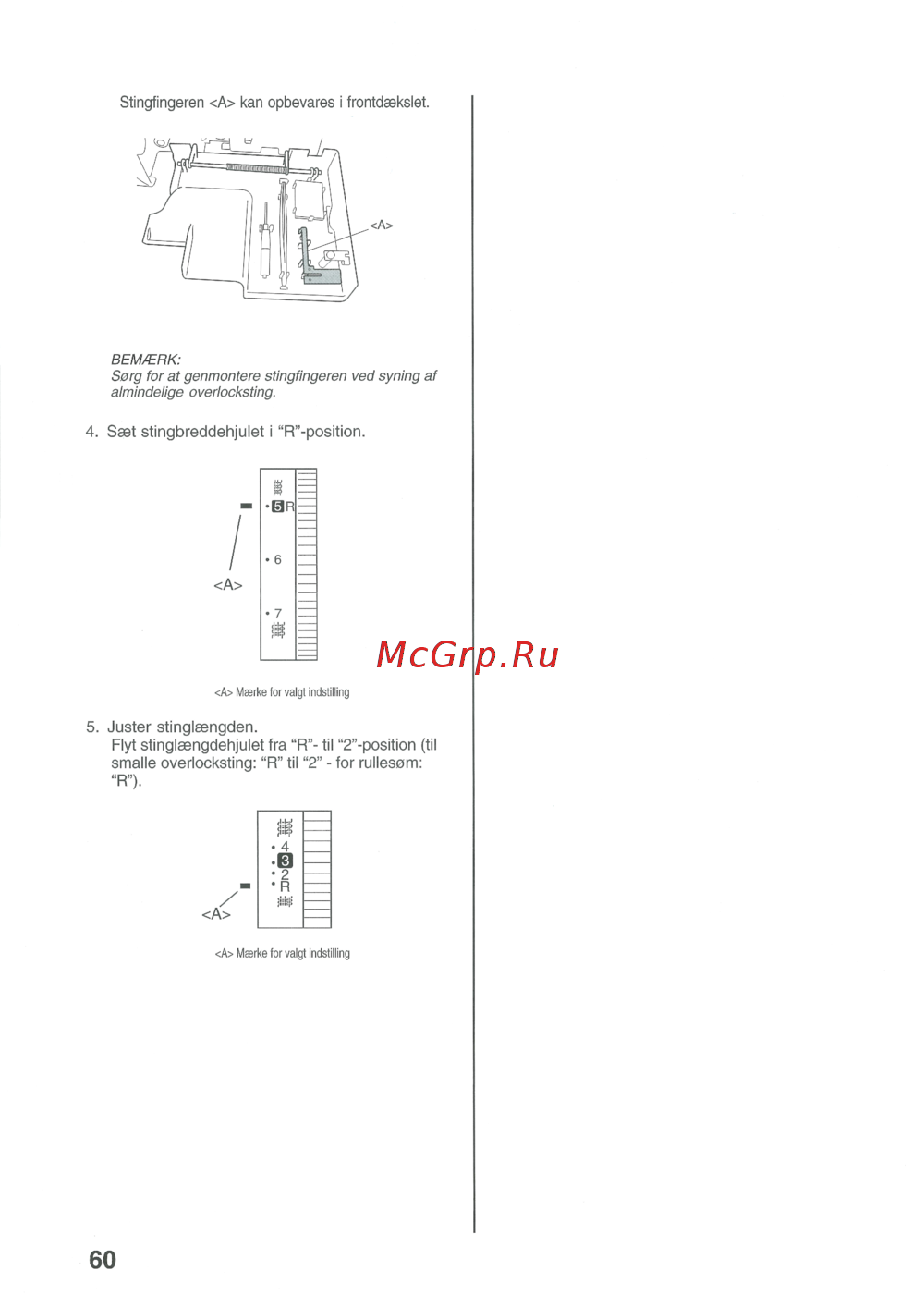 Stingfingeren A kan opbevares i frontdækslet BEMÆRK Sorg for at genmontere stingfingeren ved syning af almindelige overlocksting 4 Sæt stingbreddehjulet i R position A Mærke for valgt indstilling 5 Juster stinglængden Flyt stinglængdehjulet fra R til 2 position til smalle overlocksting R til 2 for rullesom R 60