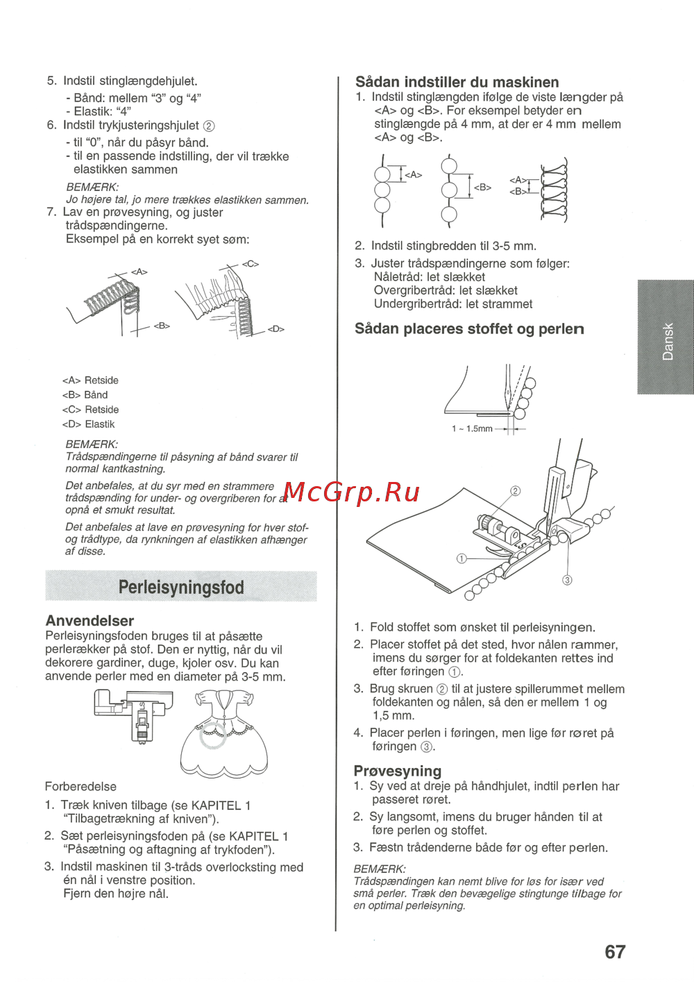 5 Indstil stinglaengdehjulet Sâdan indstiller du maskinen Bänd mellem 3 og 4 Elastik 4 6 Indstil trykjusteringshjulet 1 Indstil stinglængden folge de viste længder pâ A og B For eksempel betyder en stinglængde pâ 4 mm at der er 4 mm mellem A og B til 0 när du päsyr band til en passende indstilling der vil treekke elastikken sammen BEM ERK Jo hojere tal jo mere traekkes elastikken sammen 7 Lav en provesyning og juster trädspaendingerne Eksempel pä en korrekt syet som 2 Indstil stingbredden til 3 5 mm Dansk 3 Juster tràdspændingeme som folger Nâletrâd let slækket Overgribertrâd let slækket Undergribertrâd let strammet Sâdan placeras stoffet og perlen A Retside B Bänd C Retside D Elastik BEMÆRK Tràdspændingeme til pàsyning af band svarer til normal kantkastning Det anbefales at du syr med en strammere tràdspænding for under og overgriberen for at opnà et smukt résultat Det anbefales at lave en provesyning for hver stofog tradtype da rynkningen af elastikken afhænger af disse Perleisyningsfod Anvendelser Perleisyningsfoden bruges til at pasaette perlereekker pa stof Den er nyttig nar du vil dekorere gardiner duge kjoler osv Du kan anvende perler med en diameter pa 3 5 mm 1 Fold stoffet som onsket til perleisyningen 2 Placer stoffet pâ det sted hvor nâlen rammer mens du sorger for at foldekanten rettes ind efter foringen 3 Brug skruen til at justere spillerummet mellem foldekanten og nâlen sâ den er mellem 1 og 1 5 mm 4 Placer perlen i foringen men lige for roret pâ foringen Provesyning Forberedelse 1 1 Træk kniven tilbage se KAPITEL 1 Tilbagetrækning af kniven Sy ved at dreje passeret roret 2 2 Sæt perleisyningsfoden pâ se KAPITEL 1 Pâsætning og aftagning af trykfoden Sy langsomt imens fore perlen og stoffet 3 Fsestn trädenderne bäde for og efter perlen 3 Indstil maskinen til 3 trâds overlocksting med én nâl i venstre position Fjern den hojre nâl pä händhjulet du bruger indtil perlen händen til har at BEM ERK Trädspaendingen kan nemt blive for los for isaer ved smä perler Traek den bevaegelige stingtunge tilbage for en optimal perleisyning 67