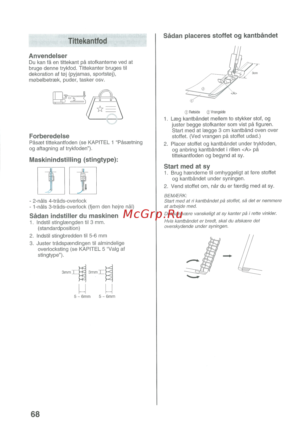 Sádan placeres stoffet og kantbándet Tittekantfod Anvendelser Du kan fá en tittekant pá stofkanterne ved at bruge denne trykfod Tittekanter bruges til dekoration af toj pyjamas sportstoj mobelbetraek puder tasker osv Retside Vrangside 1 Laeg kantbándet mellem to stykker stof og juster begge stofkanter som vist pá figuren Start med at laegge 3 cm kantbánd oven over stoffet Ved vrangen pá stoffet udad Forberedelse Pásaet tittekantfoden se KAPITEL 1 Pásaetning og aftagning af trykfoden Maskinindstilling stingtype 2 Placer stoffet og kantbándet under trykfoden og anbring kantbándet i hilen A pá tittekantfoden og begynd at sy Start med at sy 1 Brug haenderne til omhyggeligt at fore stoffet og kantbándet under syningen 2 Vend stoffet om nár du er faerdig med at sy 2 náls 4 tráds overlock 1 náls 3 tráds overlock fjern den hojre nál Sádan indstiller du maskinen 1 Indstil stinglaengden til 3 mm standardposition 2 Indstil stingbredden til 5 6 mm 3 Juster trádspaendingen til almindelige overlocksting se KAPITEL 5 Valg af stingtype 5 6mm 5 6mm 68 BEM ERK Start med at ri kantbándet pá stoffet sá det er nemmere at arbejde med Det kan vaere vanskeligt at sy kanter pá i rette vinkler Hvis kantbándet er bredt skal du afskaere det overskydende under syningen