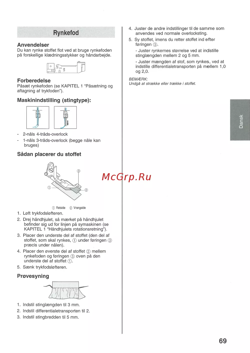 4 Juster de andre indstillinger til anvendes ved normale overlocksting 5 Sy stoffet foringen Rynkefod Anvendelser Du kan rynke stoffet flot ved at bruge pá forskellige klaedningsstykker og hándarbejde rynkefoden imens du retter de stoffet samme ind som efter Juster rynkernes storrelse ved at indstille stinglaengden mellem 2 og 5 mm Juster maengden af Stof som rynkes ved at indstiIle differentialetransporten pä mellem 1 0 og 2 0 Forberedelse Päsaet rynkefoden se aftagning af trykfoden KAPITEL 1 Pásaetning og BEM ERK Undgä at straekke eller traekke i stoffet Dansk Maskinindstilling stingtype 2 náls 4 tráds overlock 1 náls 3 tráds overlock begge nále kan bruges Sádan placerer du stoffet Retside Vrangside 1 Loft trykfodslofteren 2 Drej händhjulet sä merket pä händhjulet befinder sig ud for linjen pä symaskinen se KAPITEL 1 Händhjulets rotationsretning 3 Placer den anderste del af stoffet den del af stoffet som skal rynkes under foringen praecis under nälen 4 Placer den overste del af stoffet mellem rynkefoden og foringen oven pä den underste del af stoffet 5 Saenk trykfodslofteren Provesyning 1 Indstil stinglaengden til 3 mm 2 Indstil differentialetransporten til 2 3 Indstil stingbredden til 5 mm 69