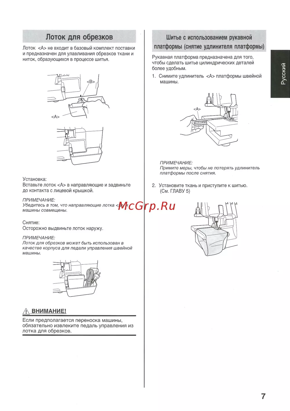Лоток А не входит в базовый комплект поставки и предназначен для улавливания обрезков ткани и ниток образующихся в процессе шитья Шитье с использованием рукавной платформы снятие удлинителя платформы Рукавная платформа предназначена для того чтобы сделать шитье цилиндрических деталей более удобным Русский Лоток для обрезков 1 Снимите удлинитель А платформы швейной машины ПРИМЕЧАНИЕ Примите меры чтобы не потерять удлинитель платформы после снятия Установка Вставьте лоток А в направляющие и задвиньте до контакта с лицевой крышкой 2 Установите ткань и приступите к шитью ПРИМЕЧАНИЕ Убедитесь в том что направляющие лотка В и машины совмещены Снятие Осторожно выдвиньте лоток наружу ПРИМЕЧАНИЕ Лоток для обрезков может быть использован в качестве корпуса для педали управления швейной машины Д ВНИМАНИЕ ______________________ Если предполагается переноска машины обязательно извлеките педаль управления из лотка для обрезков 7