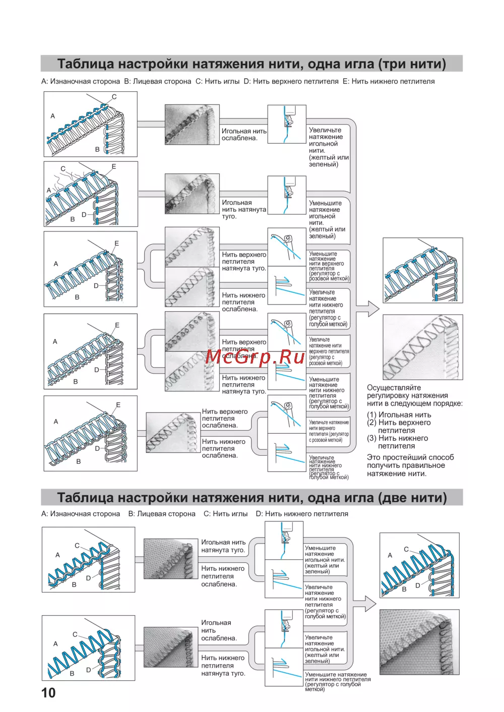 A: Изнаночная сторона B: Лицевая сторона C: Нить иглы D: Нить верхнего петлителя E: Нить нижнего петлителя
