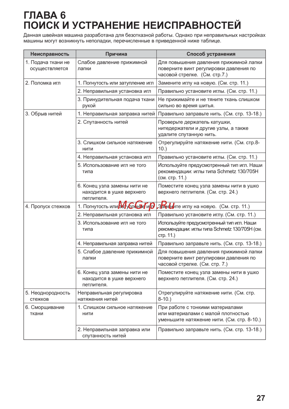 4. Пропуск стежков 1. Погнутость или затупление игл Замените иглу на новую. (См. стр. 11.)