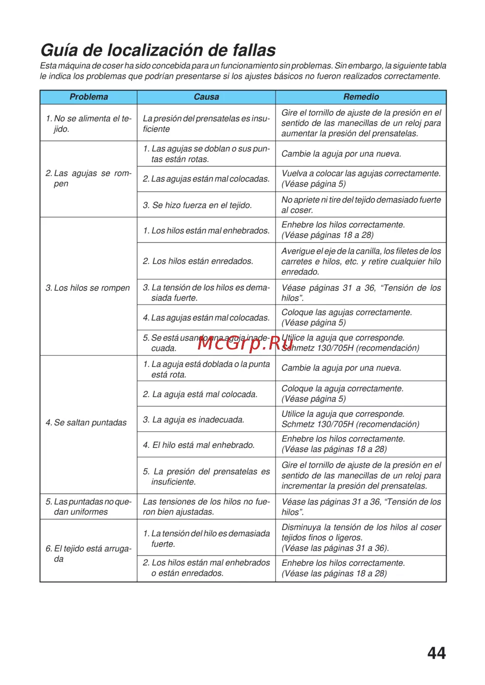 Esta máquina de coser ha sido concebida para un funcionamiento sin problemas. Sin embargo, la siguiente tabla