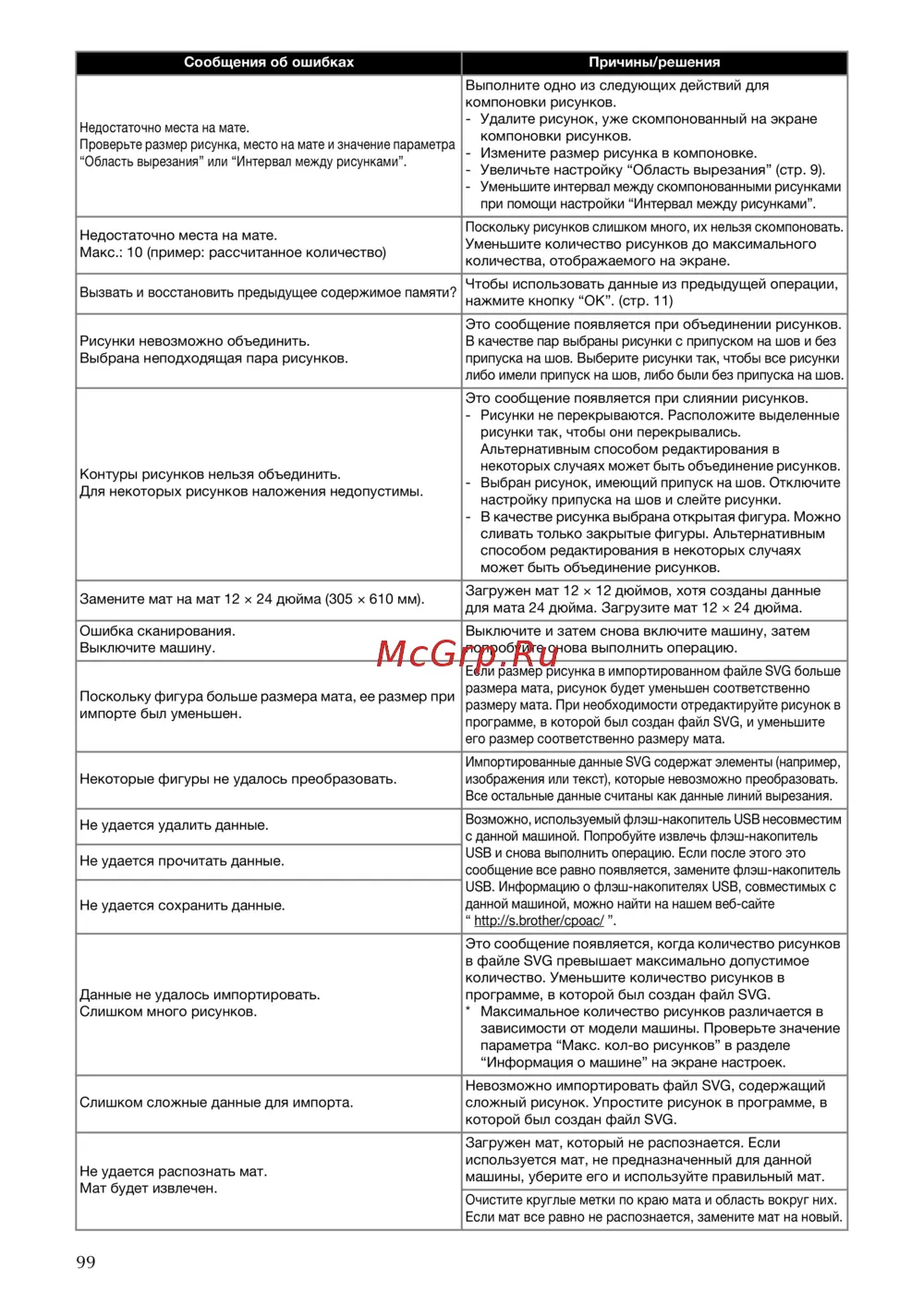 - В приведенной ниже таблице приведены некоторые сообщения об ошибках которые могут появляться во время работы машины а также способы устранения соответствующих ошибок в случае появления сообщения об ошибке выполните инструкции приведенные в сообщении или операции описанные в данной таблице если проблема не исчезла обратитесь в магазин в котором была куплена машина или в ближайший авторизованный сервисный центр p.111