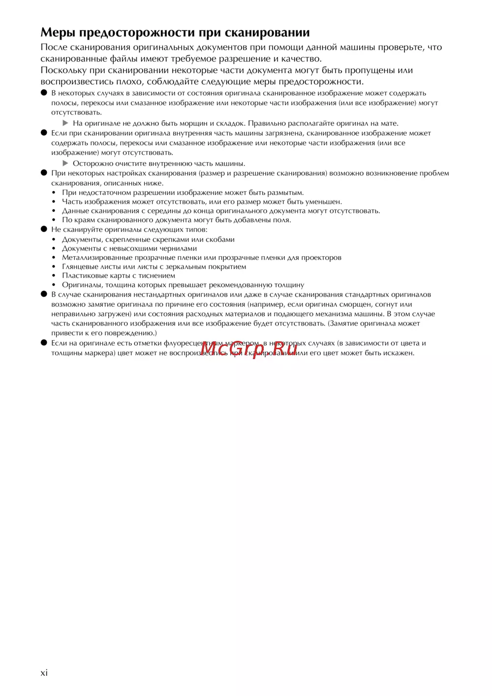 - После сканирования оригинальных документов при помощи данной машины проверьте что сканированные файлы имеют требуемое разрешение и качество поскольку при сканировании некоторые части документа могут быть пропущены или воспроизвестись плохо соблюдайте следующие меры предосторожности p.12