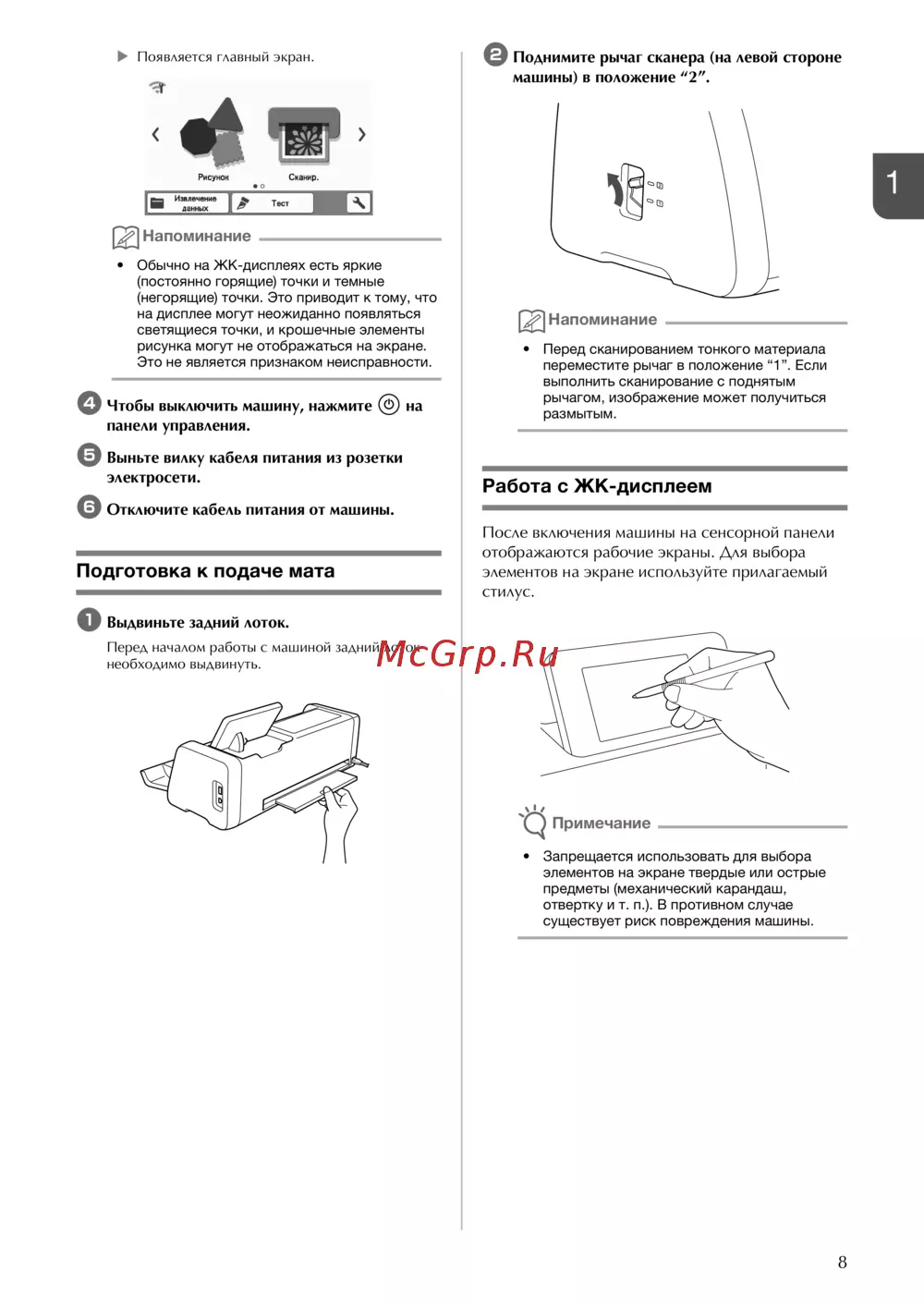 - Если при нажатии на экранные кнопки экран не реагирует надлежащим образом машина не выполняет операции или выполняет не те операции которые должна то для выполнения соответствующих регулировок выполните описанные ниже шаги p.104