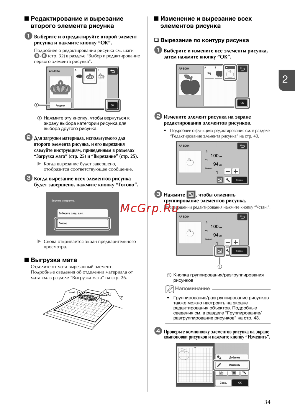 “Загрузка мата” (стр. 25) и “Вырезание” (стр. 25).