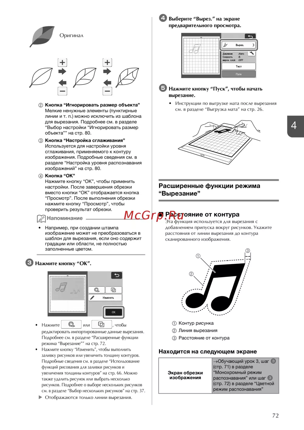 - В режиме вырезание можно автоматически отрегулировать положение вырезания если оно сместилось подробнее о режиме вырезание см в разделе сканирование для вырезания вырезание на стр 68 p.104