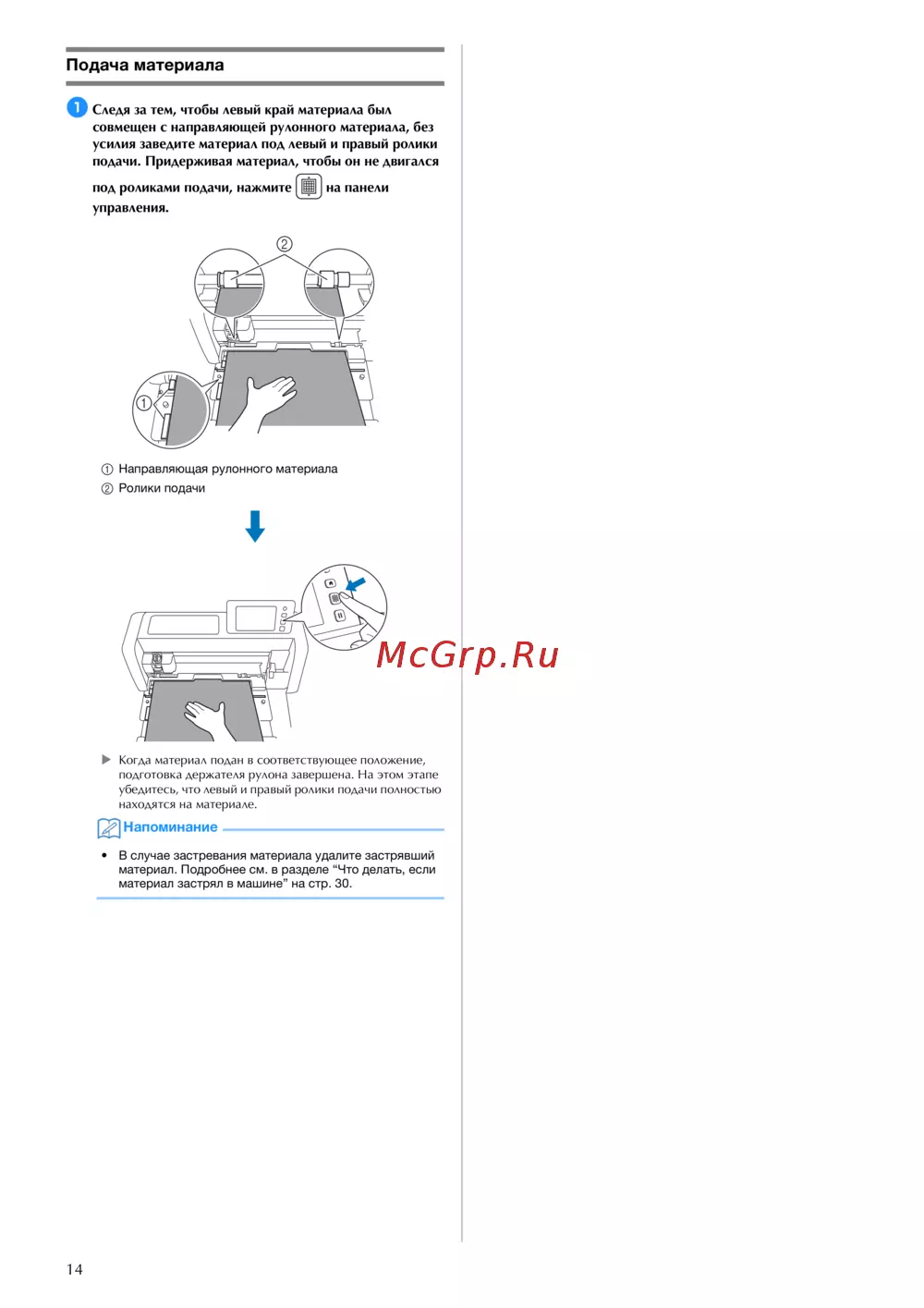 - Следя за тем чтобы левый край материала был совмещен с направляющей рулонного материала без усилия заведите материал под левый и правый ролики подачи придерживая материал чтобы он не двигался p.15