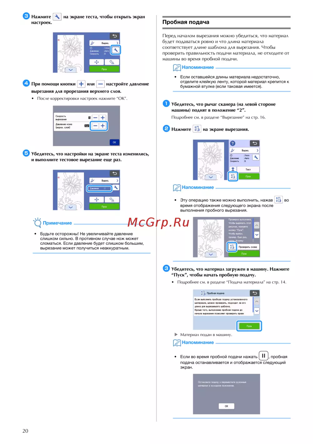 Узнайте, как правильно настроить давление вырезания и выполнить пробную подачу материала. Следуйте инструкциям для достижения аккуратных результатов.