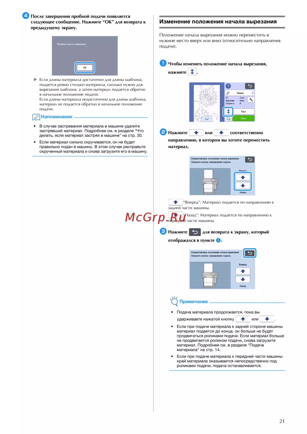 Узнайте, как правильно подавать материал и изменять положение начала вырезания. Следуйте рекомендациям для предотвращения застревания и скручивания материала.
