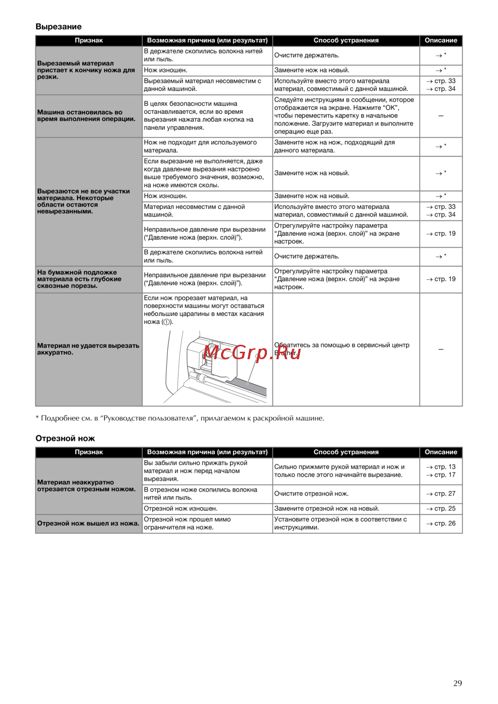 - Если машина перестала нормально работать перед обращением в сервисный центр проверьте следующее описание распространенных проблем и прочитайте ответы на часто задаваемые вопросы на сайте brother solutions center http s brother cpoac если проблема не устраняется обратитесь за помощью в сервисный центр brother если вместо номера страницы указана звездочка это означает отсылку на руководстве пользователя раскройной машины инструкции по поиску и устранению проблем беспроводного подключения см в руководстве по настройке беспроводной сети для раскройной машины p.29