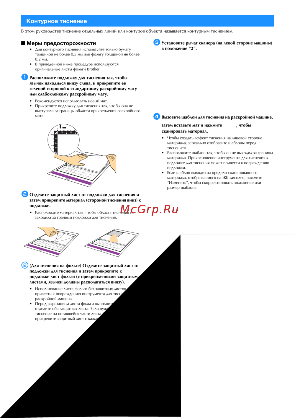 - Для тиснения на фольге отделите защитный лист от подложки для тиснения и затем прикрепите к подложке лист фольги с прикрепленными защитными листами язычки должны располагаться внизу p.3