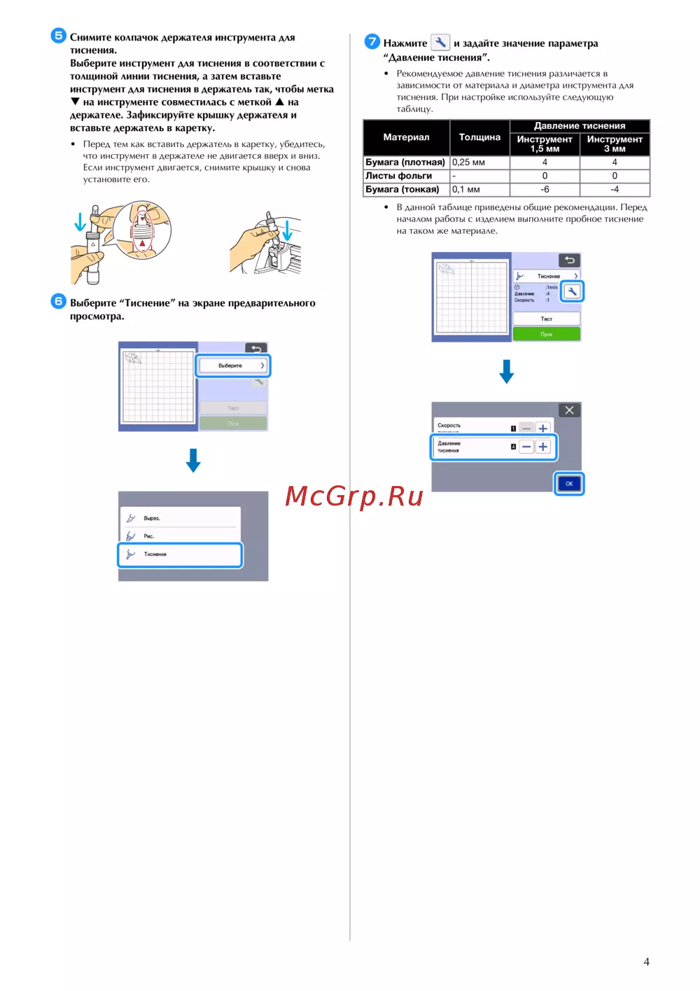 - Нажмите и задайте значение параметра давление тиснения p.4