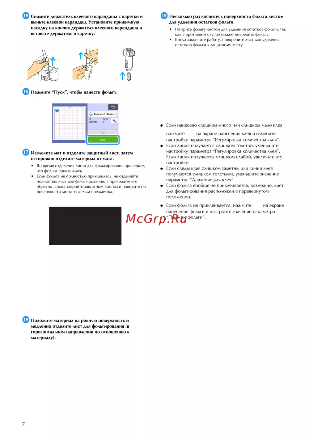 - После нанесения клея извлеките мат из машины и дайте клею высохнуть фольгу невозможно аккуратно нанести пока клей не высох p.6