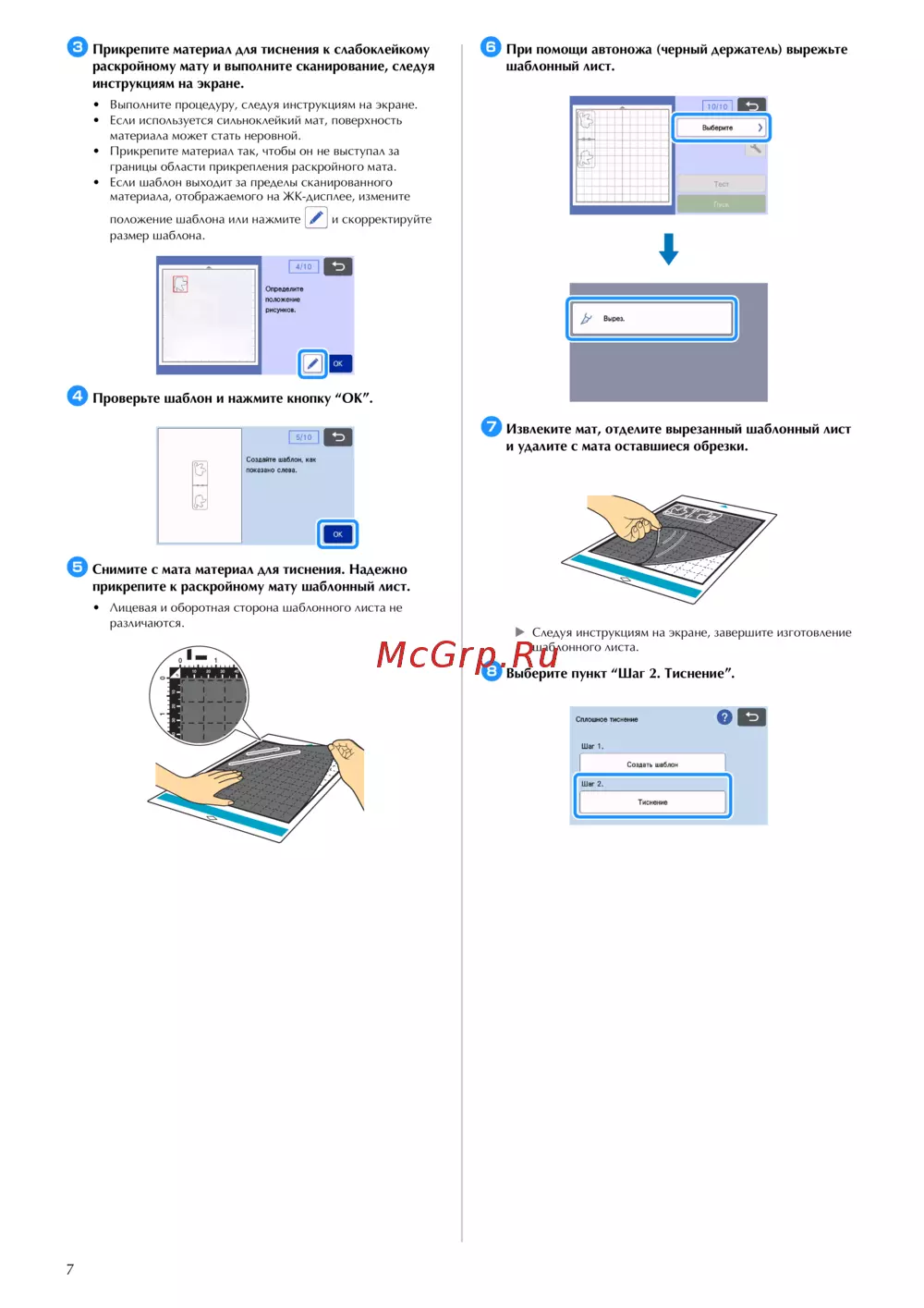 - Снимите с мата материал для тиснения надежно прикрепите к раскройному мату шаблонный лист p.7