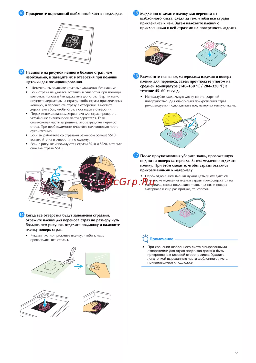 - Медленно отделите пленку для переноса от шаблонного листа следя за тем чтобы все стразы приклеились к ней затем наложите пленку с приклеенными к ней стразами на поверхность изделия p.6