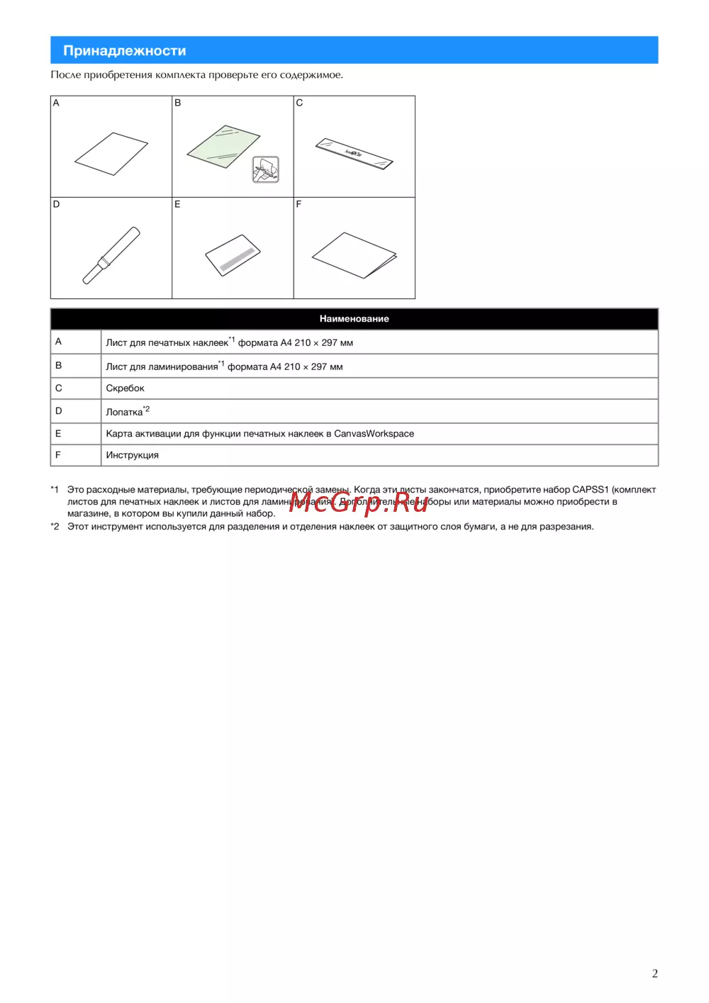 *1 Это расходные материалы, требующие периодической замены. Когда эти листы закончатся, приобретите набор CAPSS1 (комплект