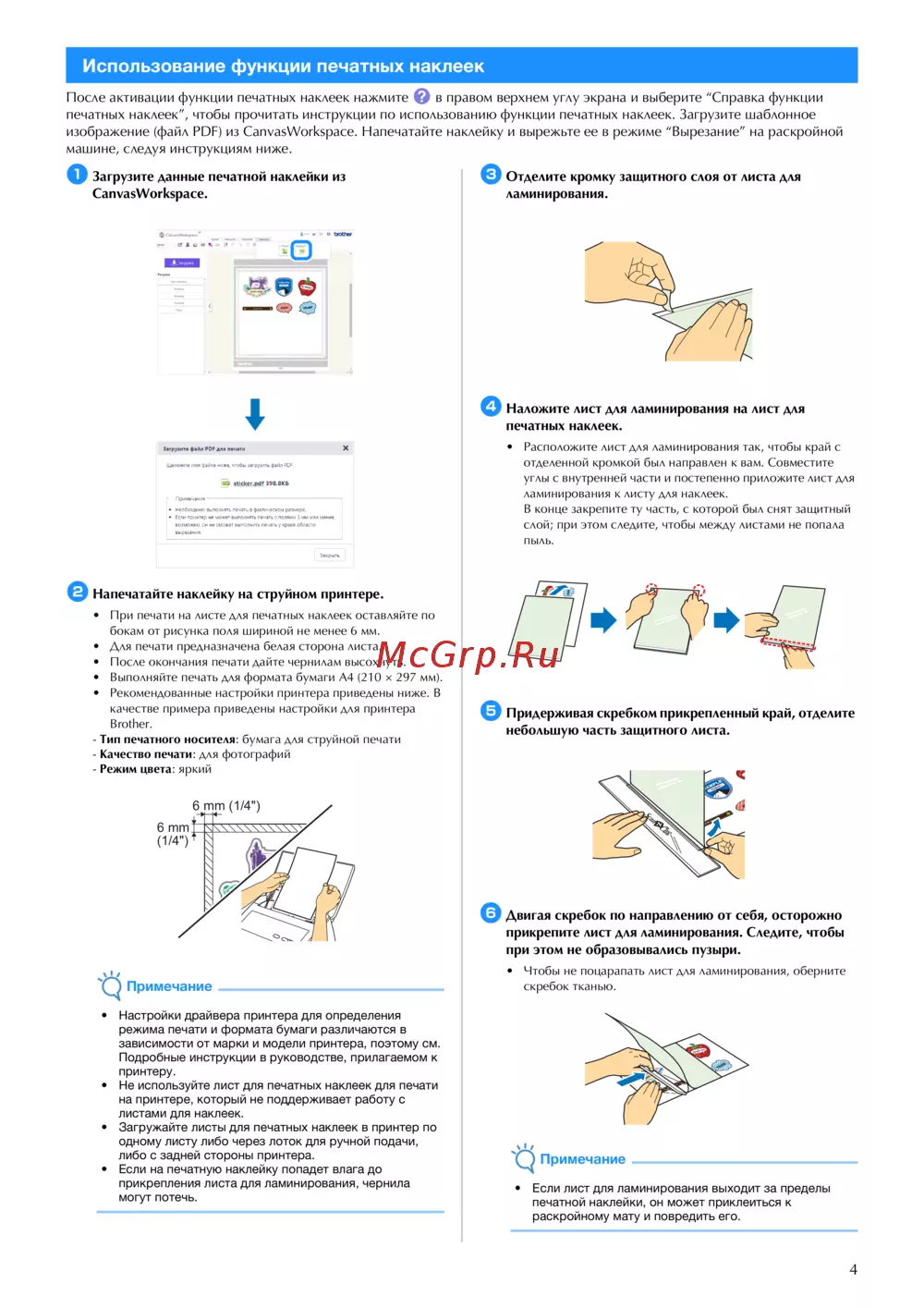 - После активации функции печатных наклеек нажмите в правом верхнем углу экрана и выберите справка функции печатных наклеек чтобы прочитать инструкции по использованию функции печатных наклеек загрузите шаблонное изображение файл pdf из canvasworkspace напечатайте наклейку и вырежьте ее в режиме вырезание на раскройной машине следуя инструкциям ниже p.4