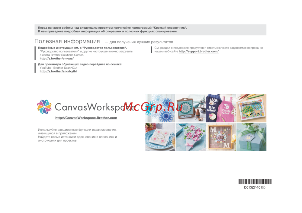 Перед началом работы над следующим проектом прочитайте прилагаемый Краткий справочник В нем приведена подробная информация об операциях и полезных функциях сканирования Полезная информация для получения лучших результатов Подробные инструкции см в Руководстве пользователя Руководство пользователя и другие инструкции можно загрузить с сайта Brother Solutions Center См раздел о поддержке продуктов и ответы на часто задаваемые вопросы на нашем веб сайте http support brother com http s brother cmoae Для просмотра обучающих видео перейдите по ссылке YouTube Brother ScanNCuthttp s brother sncdxytb CanvasWorkspace http CanvasWorkspace Brother com Используйте расширенные функции редактирования имеющиеся в приложении Найдите новые источники вдохновения в описаниях и инструкциях для проектов IIIIIIIIIIIIIIIIIIIIIIIIIIIIIIIIII D013Z7 101