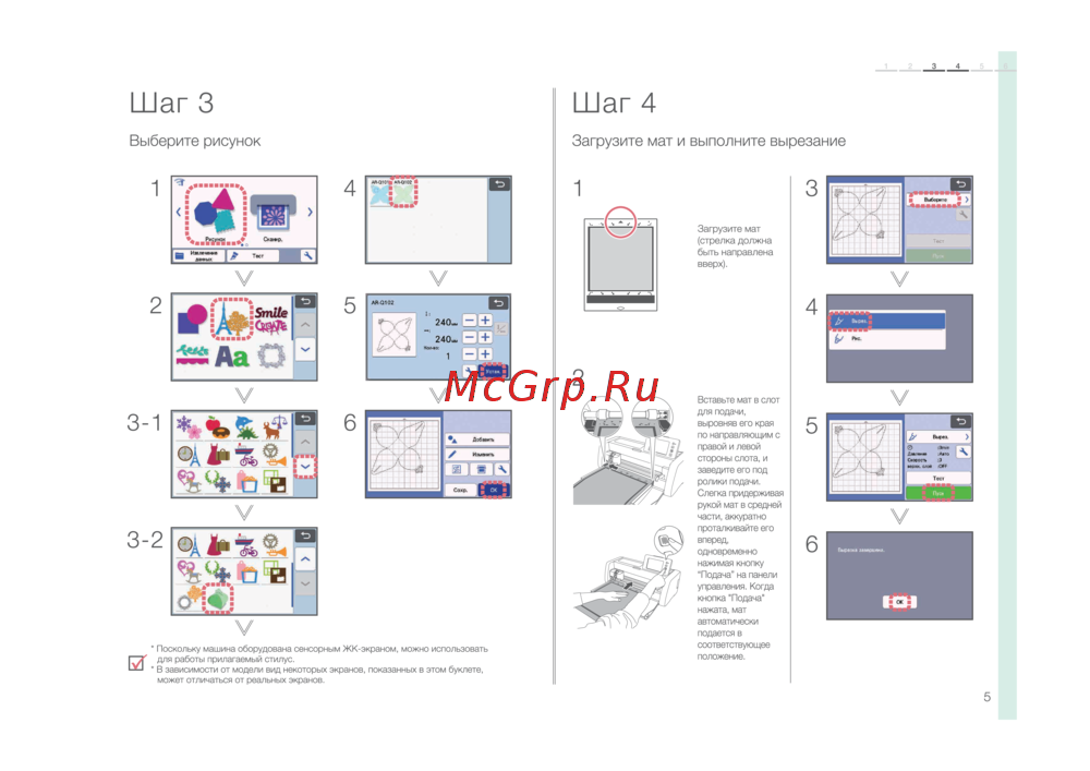 3 Шаг 3 Шаг 4 Выберите рисунок Загрузите мат и выполните вырезание Загрузите мат стрелка должна быть направлена вверх 2 Вставьте мат в слот для подачи выровняв его края по направляющим с правой и левой стороны слота и заведите его под ролики подачи Слегка придерживая рукой мат в средней части аккуратно проталкивайте его вперед одновременно нажимая кнопку Подача на панели управления Когда кнопка Подача нажата мат автоматически подается в Поскольку машина оборудована сенсорным ЖК экраном можно использовать для работы прилагаемый стилус В зависимости от модели вид некоторых экранов показанных в этом буклете может отличаться от реальных экранов соответствующее положение 4