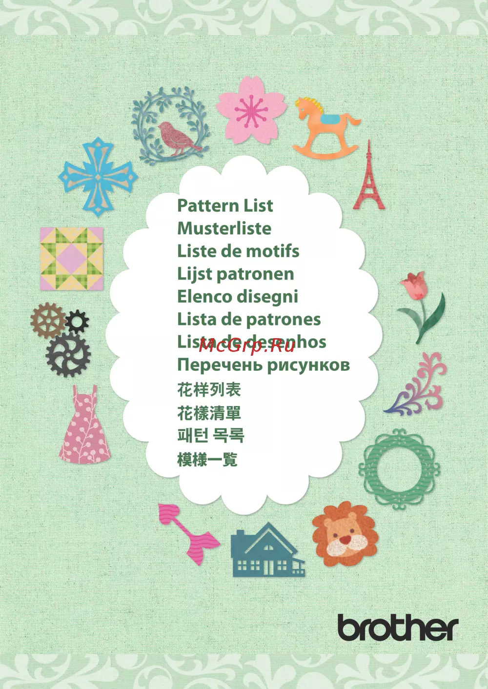 - 注意 本机预编程以及包含版权通知的花样 不包括经确认受相关文档中条款管辖的花样 仅供私人专用 版权法严格禁 止将其用作商用 本文档所显示花样的颜色可能与屏幕上显示的不同 有关内置花样的条款和条件 请访问我们的网站 http s brother cmoaa p.20