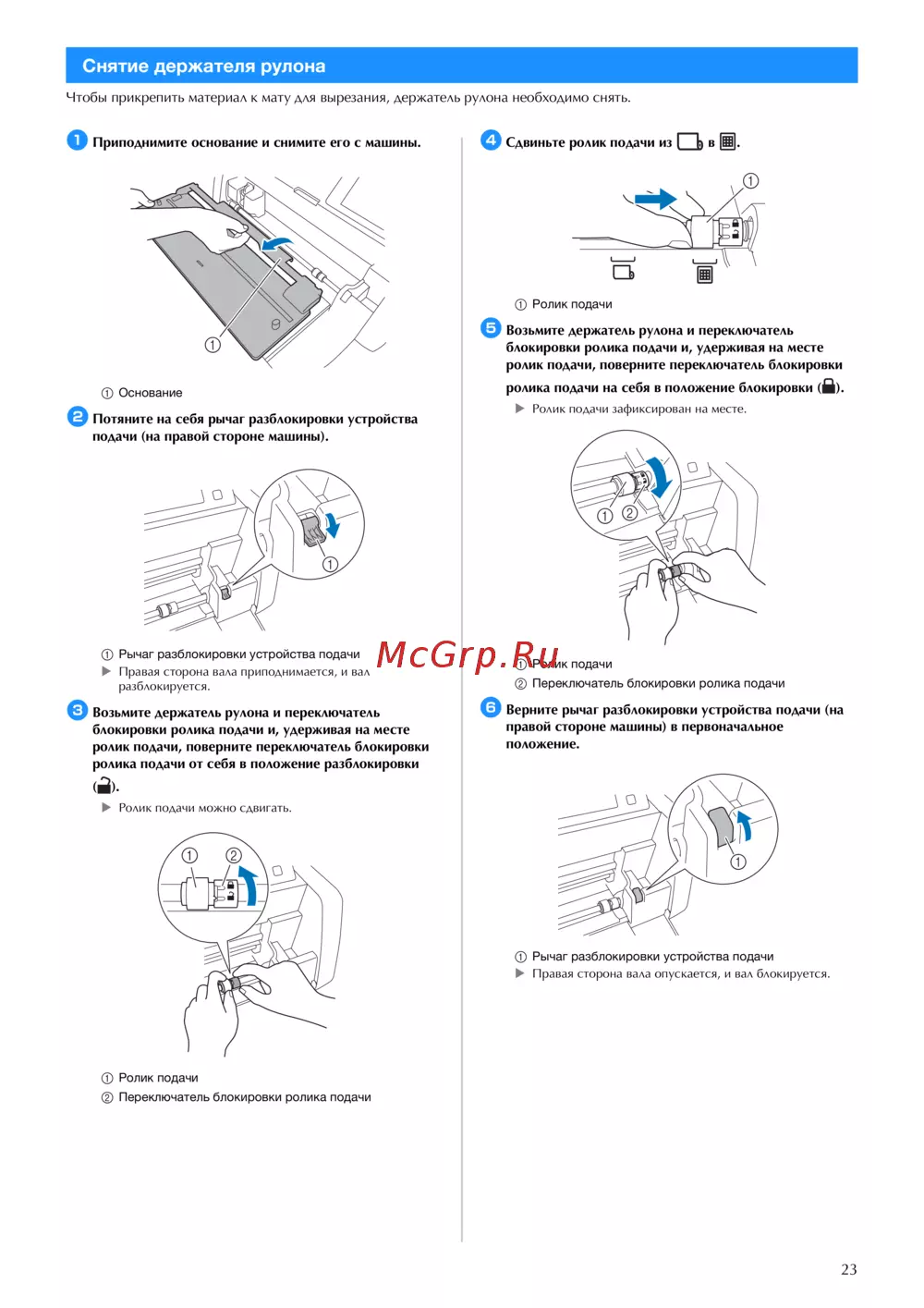 Подробная инструкция по снятию держателя рулона и блокировке ролика подачи для успешного прикрепления материала к мату для вырезания.