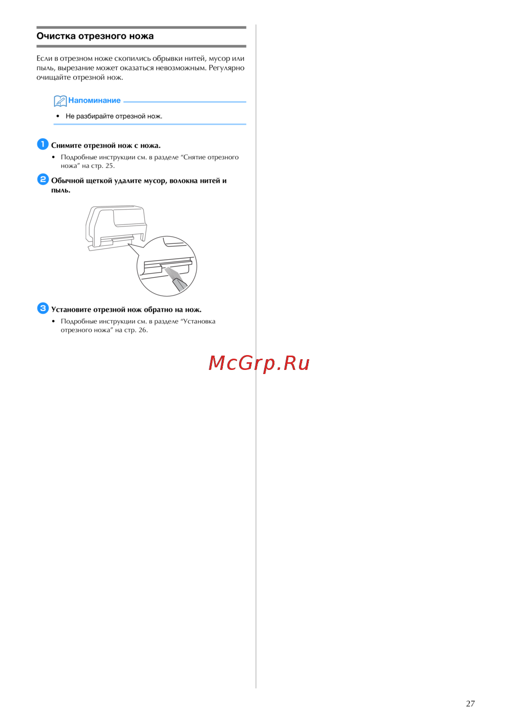 - Возьмите отрезной нож как показано на рисунке ниже и вставьте язычок с правой стороны в направляющую ножа p.27