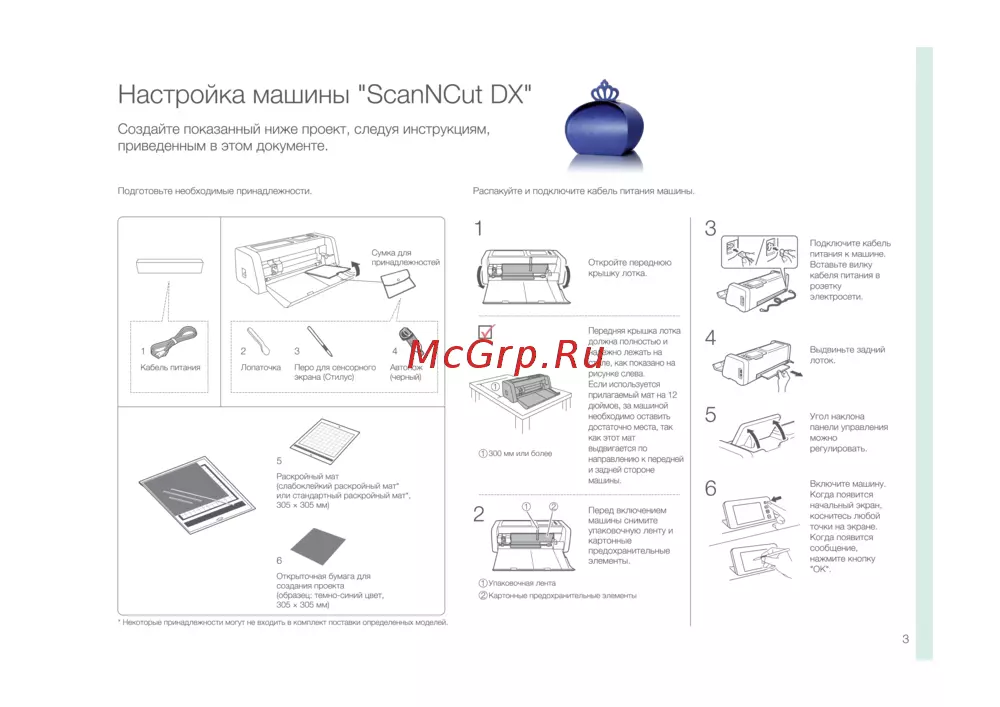 Настройка машины ЗсапМСи ОХ Создайте показанный ниже проект следуя инструкциям приведенным в этом документе Подготовьте необходимые принадлежности Распакуйте и подключите кабель питания машины Подключите кабель питания к машине Откройте переднюю крышку лотка Вставьте вилку кабеля питания в розетку электросети Передняя крышка лотка должна полностью и надежно лежать на столе как показано на рисунке слева Если используется Выдвиньте задний лоток прилагаемый мат на 12 дюймов за машиной необходимо оставить 300 мм или более Раскройный мат слабоклейкий раскройный мат или стандартный раскройный мат 305 х 305 мм Открыточная бумага для создания проекта образец темно синий цвет 305 х 305 мм достаточно места так как этот мат выдвигается по Угол наклона панели управления можно регулировать направлению к передней и задней стороне машины Перед включением машины снимите упаковочную ленту и картонные предохранительные элементы Включите машину Когда появится начальный экран коснитесь любой точки на экране Когда появится сообщение нажмите кнопку ОК Упаковочная лента 2 Картонные предохранительные элементы Некоторые принадлежности могут не входить в комплект поставки определенных моделей 3