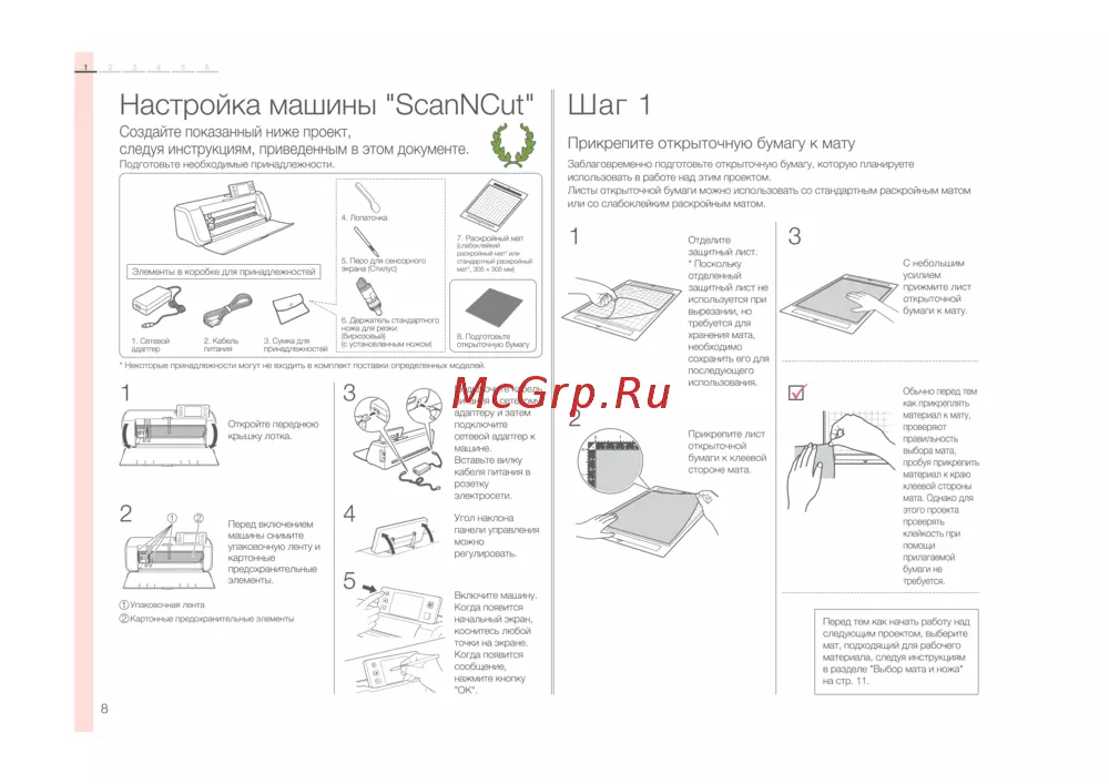 2 3 4 5 6 Настройка машины ЗсапМСиГ Шаг 1 Создайте показанный ниже проект следуя инструкциям приведенным в этом документе Прикрепите открыточную бумагу к мату Подготовьте необходимые принадлежности Заблаговременно подготовьте открыточную бумагу которую планируете использовать в работе над этим проектом Листы открыточной бумаги можно использовать со стандартным раскройным матом или со слабоклейким раскройным матом Отделите защитный лист Поскольку отделенный защитный лист не используется при вырезании но С небольшим усилием прижмите лист открыточной бумаги к мату требуется для хранения мата необходимо сохранить его для Некоторые принадлежности могут не входить в комплект поставки определенных моделей Подключите кабель питания к сетевому адаптеру и затем Откройте переднюю крышку лотка подключите сетевой адаптер к машине Вставьте вилку кабеля питания в розетку электросети Перед включением машины снимите упаковочную ленту и картонные предохранительные элементы фУпаковочная лента Картонные предохранительные элементы Обычно перед тем как прикреплять материал к мату проверяют правильность выбора мата пробуя прикрепить материал к краю клеевой стороны мата Однако для этого проекта Угол наклона панели управления проверять клейкость при можно регулировать помощи прилагаемой бумаги не требуется Включите машину Когда появится начальный экран коснитесь любой точки на экране Когда появится сообщение нажмите кнопку ОК 8 последующего использования Перед тем как начать работу над следующим проектом выберите мат подходящий для рабочего материала следуя инструкциям в разделе Выбор мата и ножа на стр 11