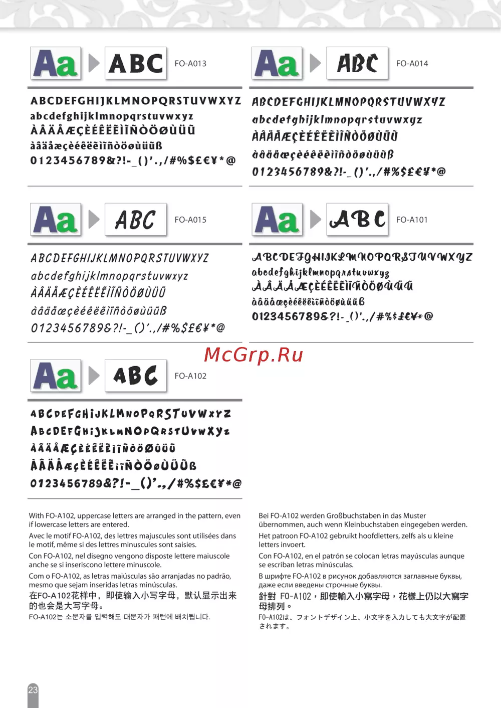 - 在fo a102花样中 即使输入小写字母 默认显示出来 的也会是大写字母 針對 fo a102 即使輸入小寫字母 花樣上仍以大寫字 母排列 p.24