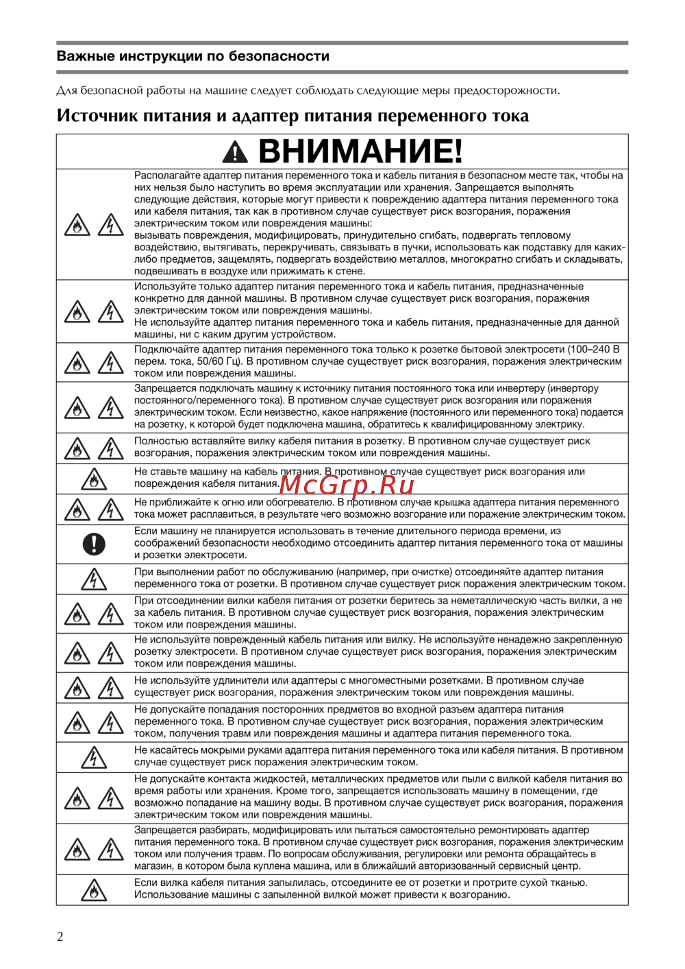 возгорания, поражения электрическим током или повреждения машины.