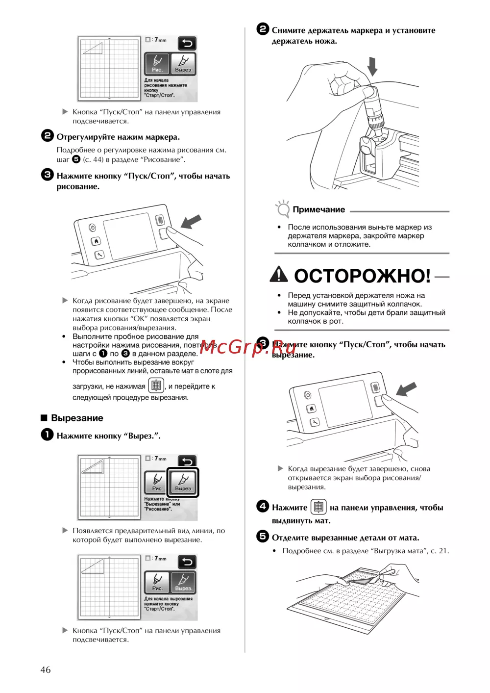 Узнайте, как правильно использовать кнопку Пуск/Стоп для рисования и вырезания. Следуйте простым шагам для настройки нажима и выполнения пробного рисования.