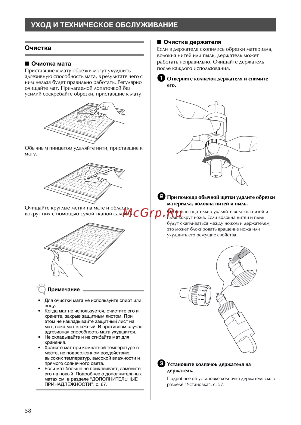 Brother CM300 — правильная очистка и уход за рабочими матами и держателями [60/72]