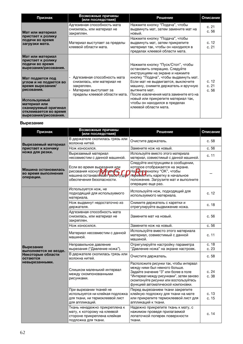 - Мат или материал пристает к ролику подачи во время вырезания рисования p.64