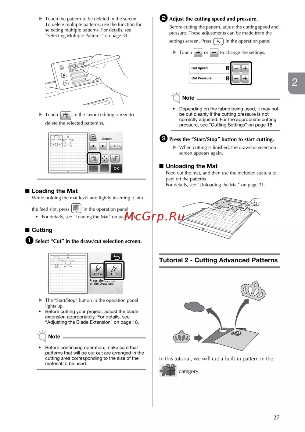 - Cuttings and cut edges of patterns attached to the mat may reduce the mat s adhesive strength and prevent correct operation periodically clean the mat using the included spatula lightly scrape off any cuttings attached to the mat p.60