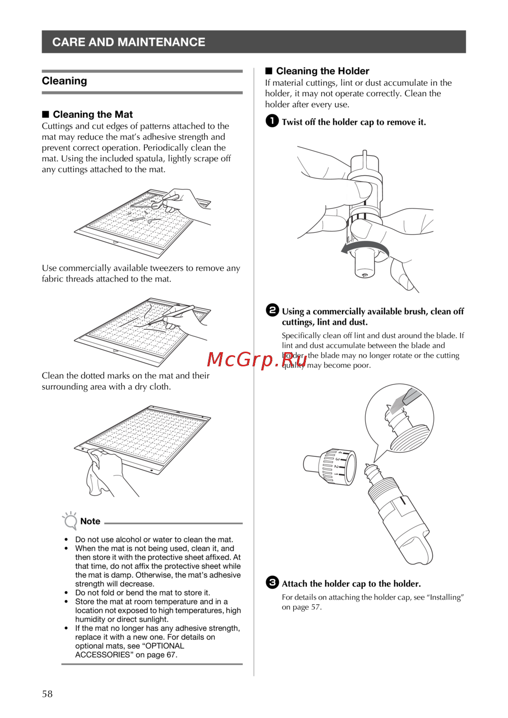 - Cuttings and cut edges of patterns attached to the mat may reduce the mat s adhesive strength and prevent correct operation periodically clean the mat using the included spatula lightly scrape off any cuttings attached to the mat p.60