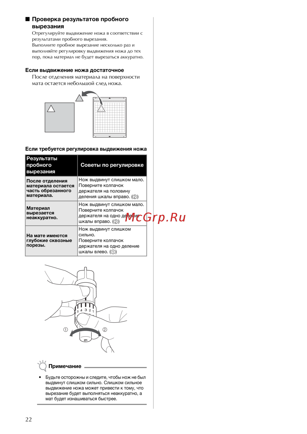 Brother CM600 — регулировка выдвижения ножа для аккуратного вырезания [24/72]