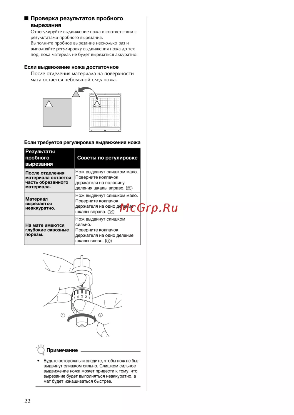 - Вырезаемый материал пристает к кончику ножа для резки p.64