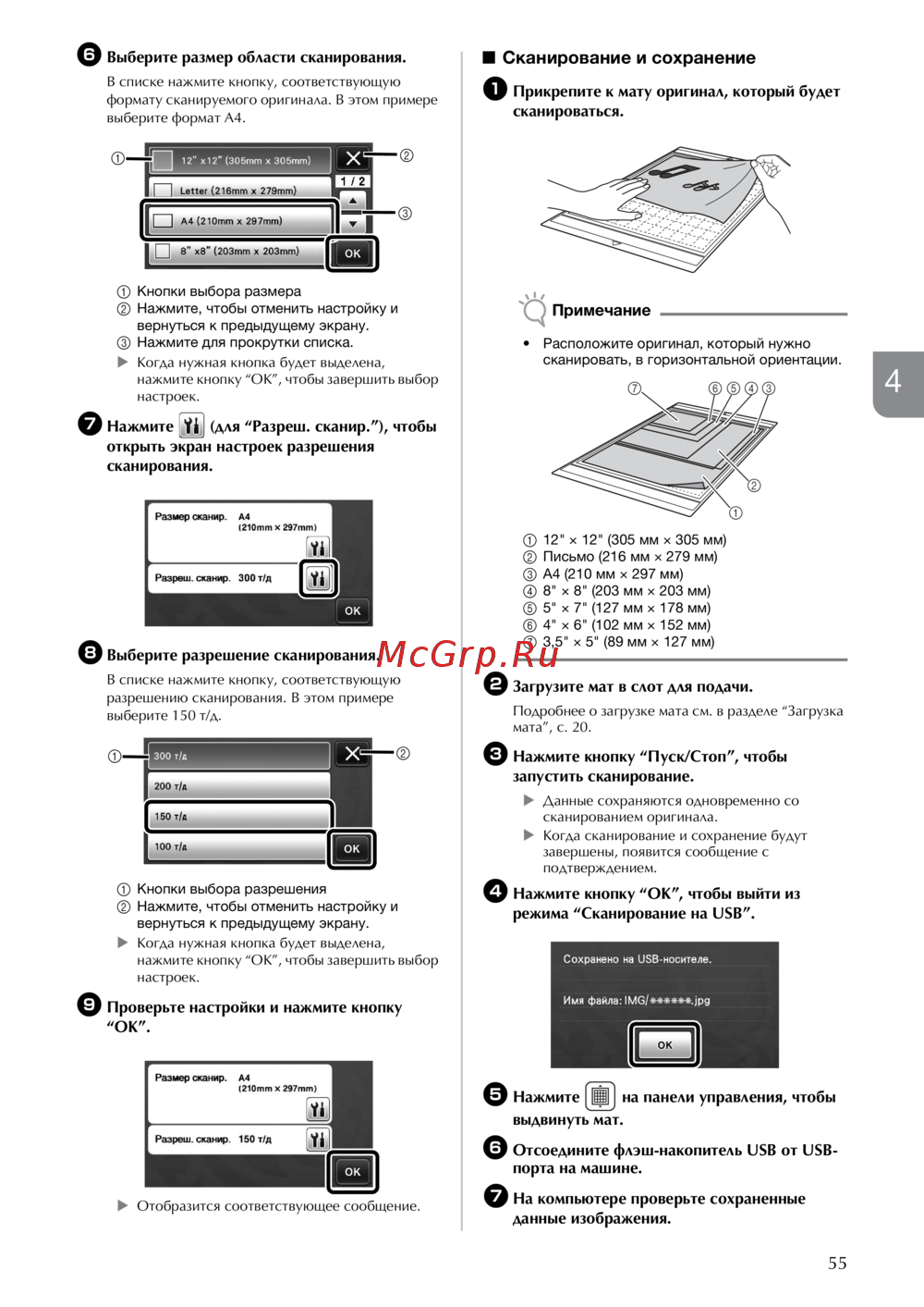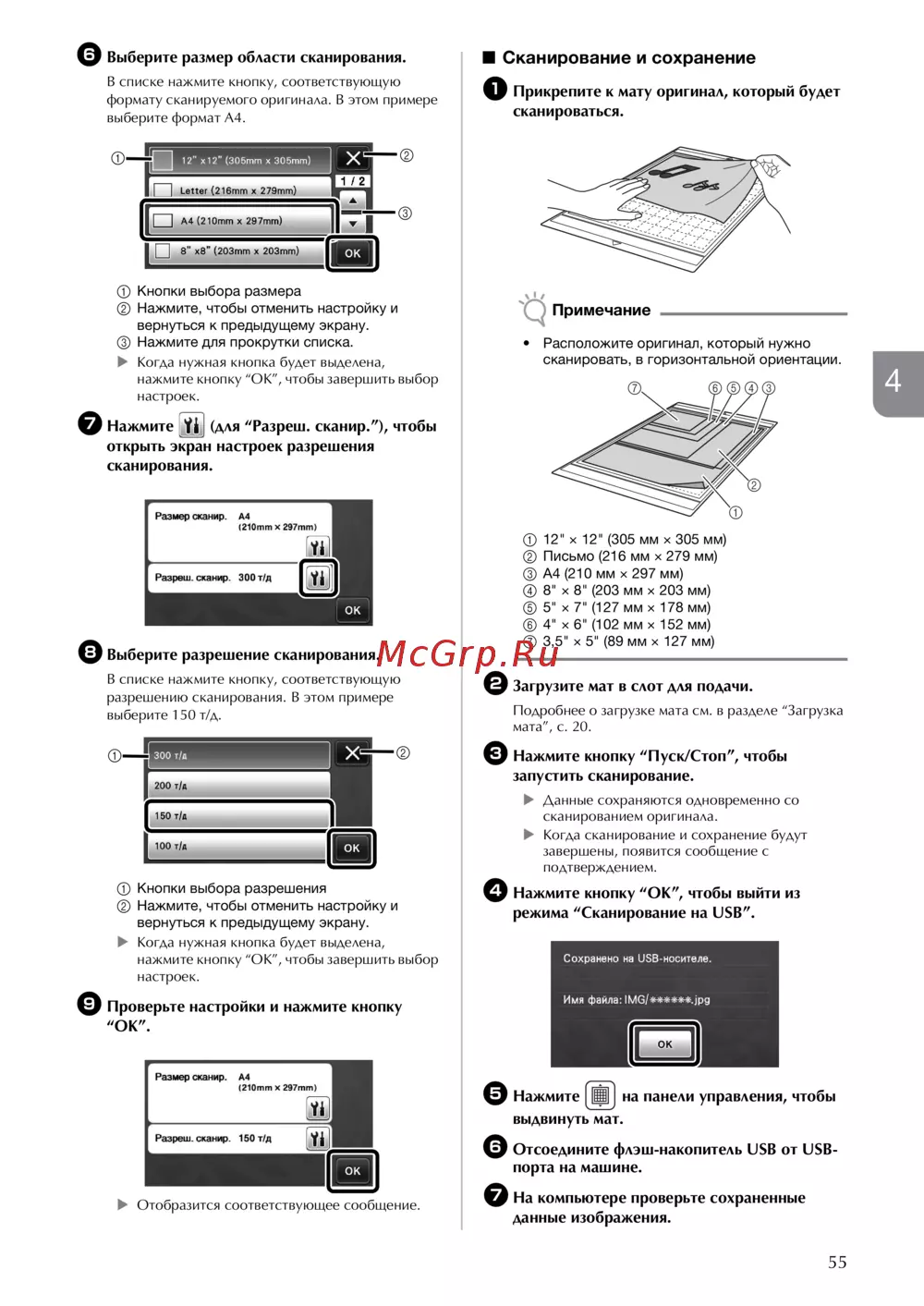 Узнайте, как правильно выбрать размер области сканирования и разрешение для ваших оригиналов. Пошаговая инструкция по настройке и сохранению сканированных данных.