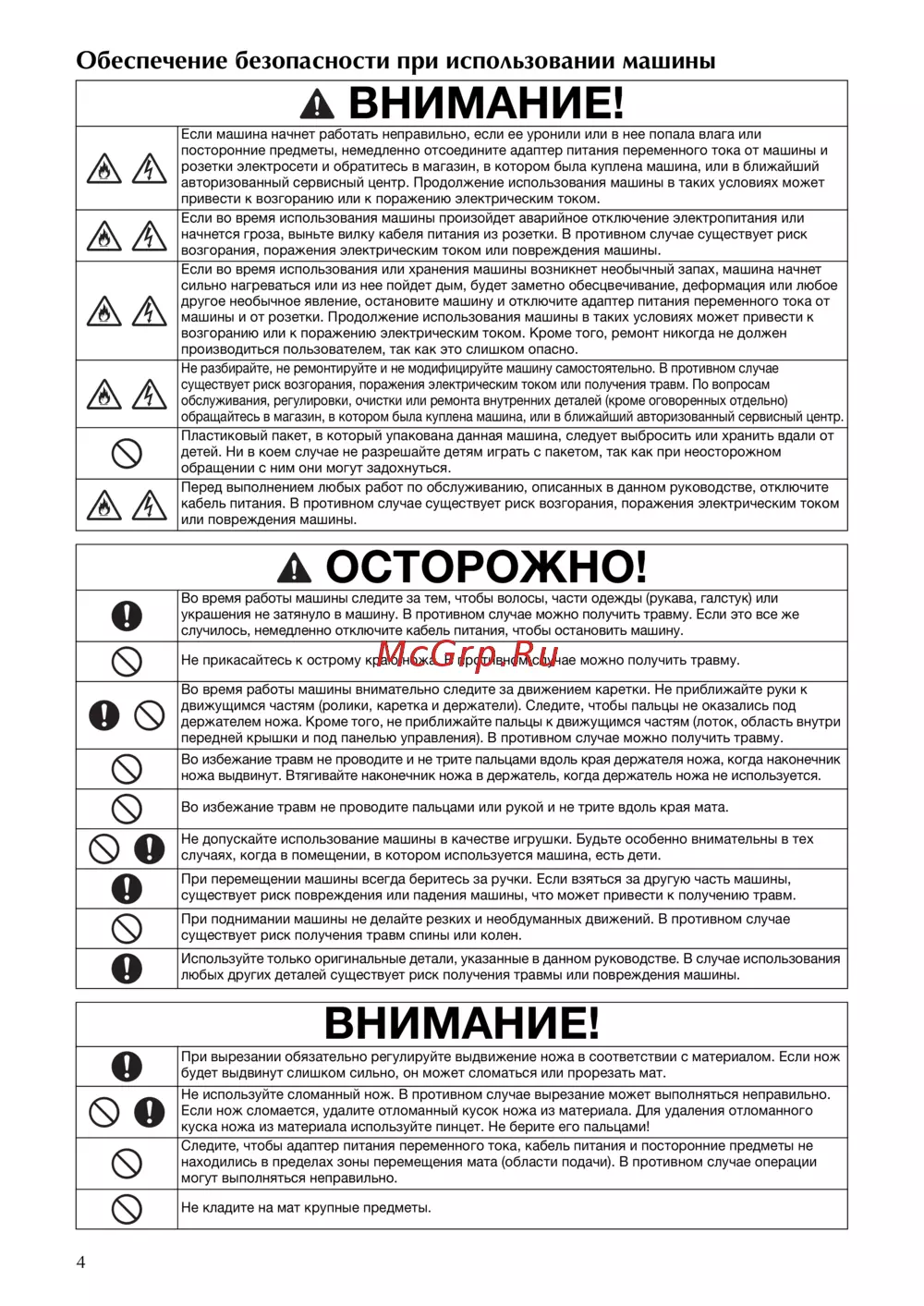 машины и от розетки. Продолжение использования машины в таких условиях может привести к