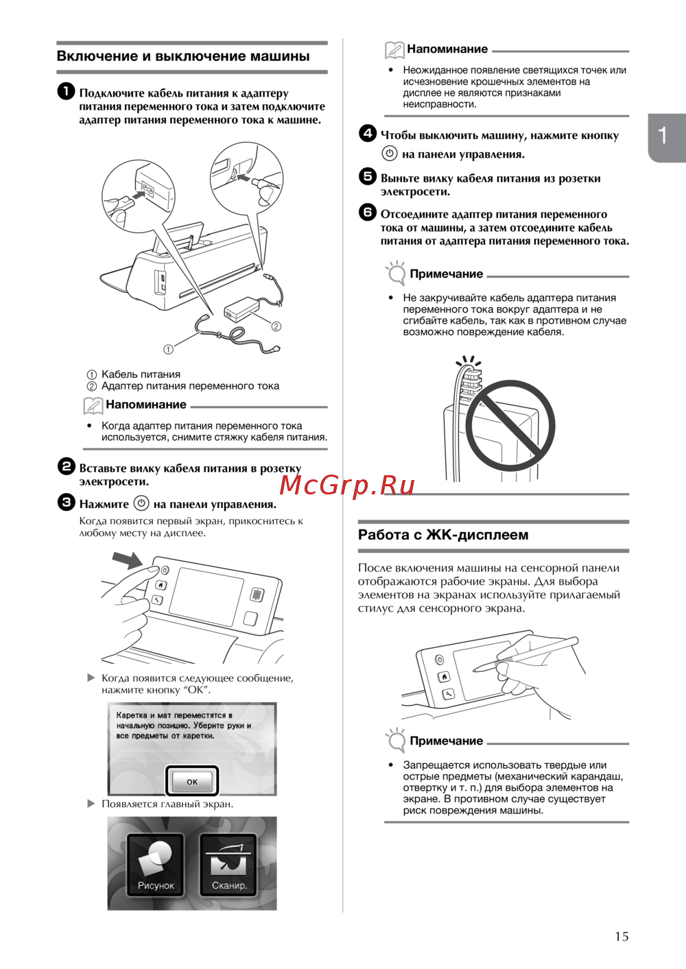 Узнайте, как правильно включать и выключать устройство с помощью адаптера питания и сенсорной панели. Следуйте простым шагам для безопасной эксплуатации.